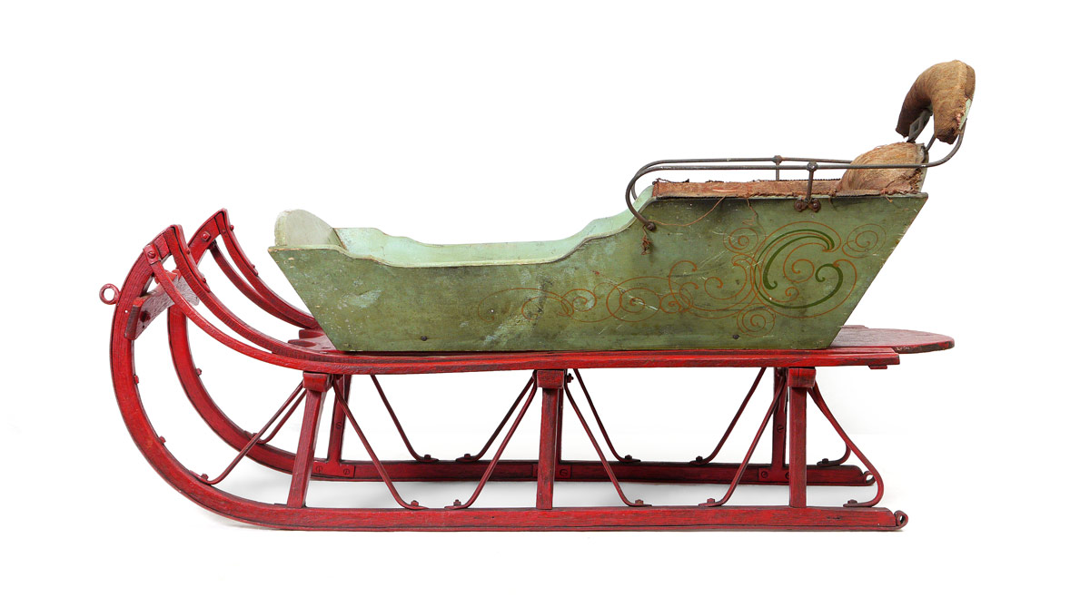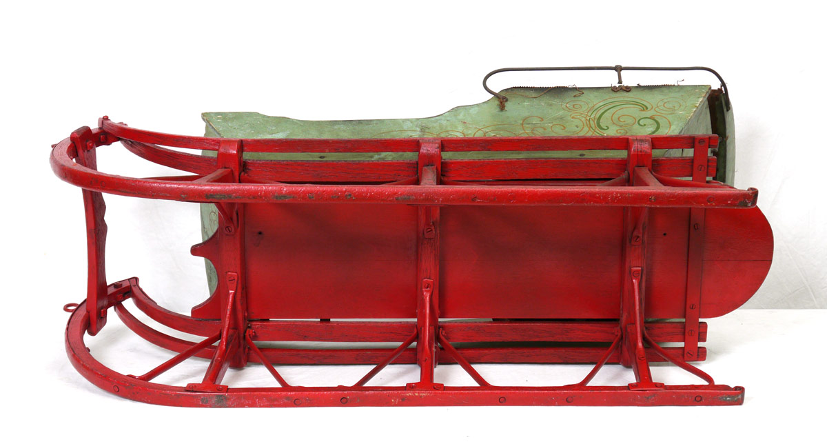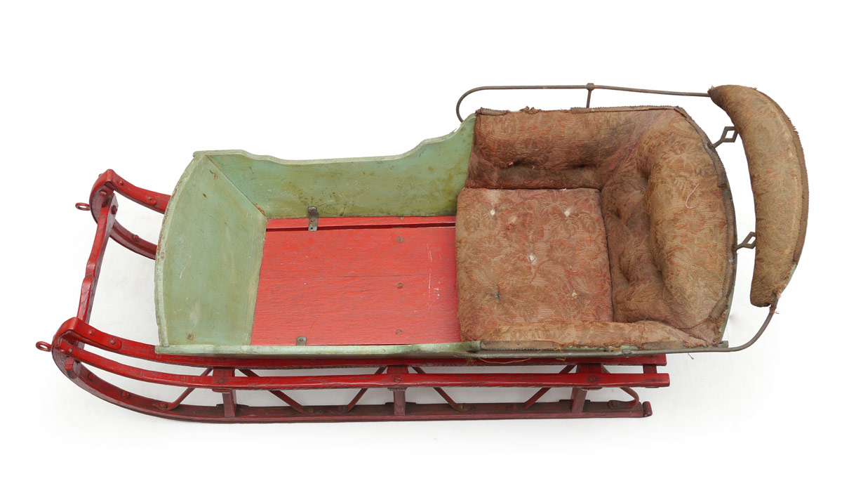 EARLY 20TH CENTURY CHILD'S SLED: Shaped wood and iron construction, top with upholstered seat and back. Measures 23 1/4'' h. x 43 1/2'' x 17 1/2''.