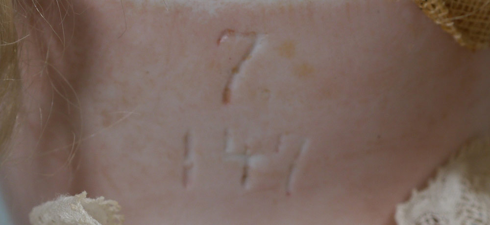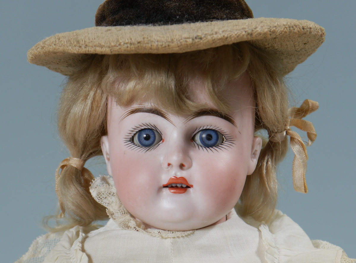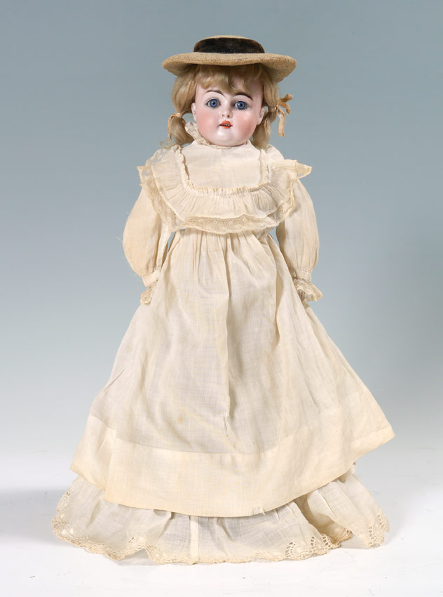 ANTIQUE GERMAN BISQUE HEAD DOLL: Bisque shoulder head marked 7/147. Sleepy blue eyes, open mouth showing teeth and blonde wig. Calf body. Black hosiery under dress and slip. Her hat is hand crafted. Height 17''.