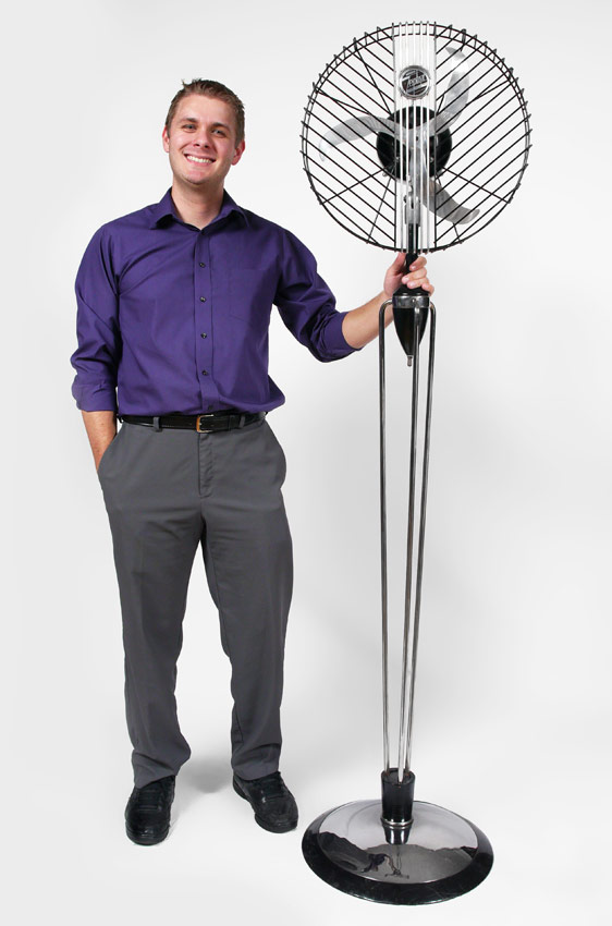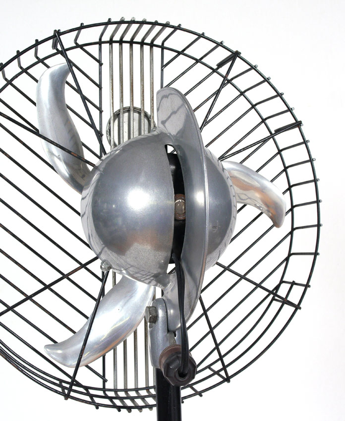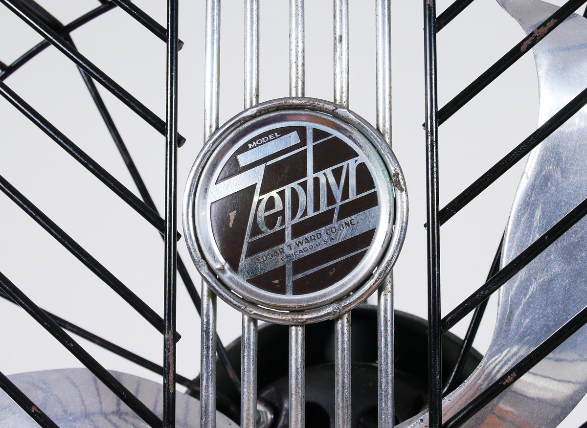 EDGAR T. WARD ZEPHYR FLOOR FAN VINTAGE 1929: Rare American Streamlined Art Deco electric floor fan. Three aluminum blades in an 18'' cage. The fan stands 6 ft tall. Edgar T. Ward Chicago name plate. Not currently in working order.