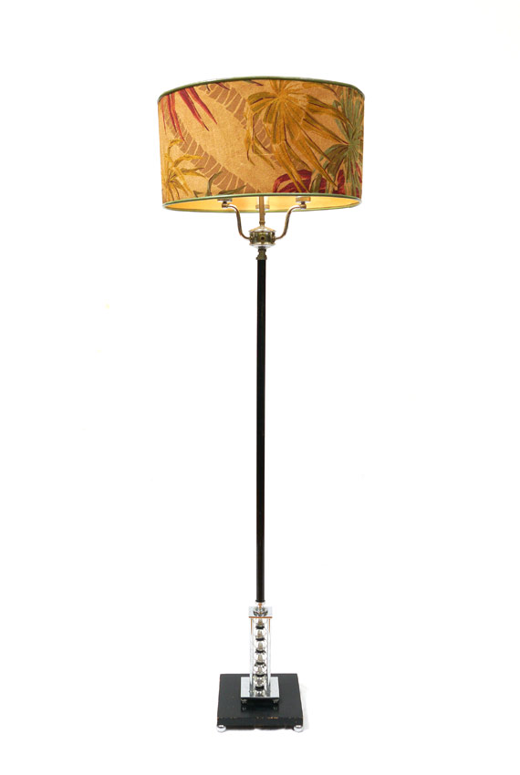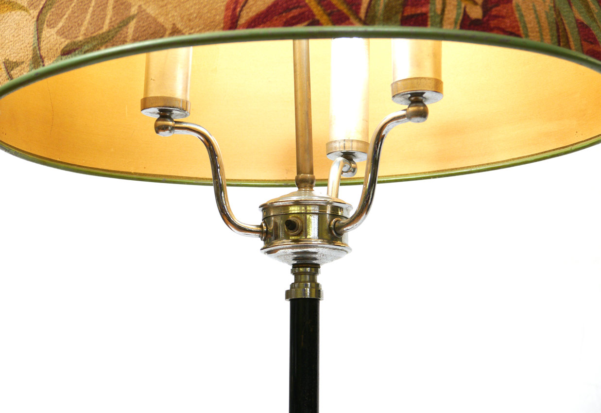 ART DECO FLOOR LAMP: Chrome 3 socket fixture over black metal shaft. Base with architectural chrome support and clear plastic balls over painted black wood with chrome ball feet. Overall measures 59 1/2'' h. x 8 3/4'' x 8 3/4''. Sold with foliate motif hard cloth shade, 9 1/2'' h. x 19 1/2'' dia.