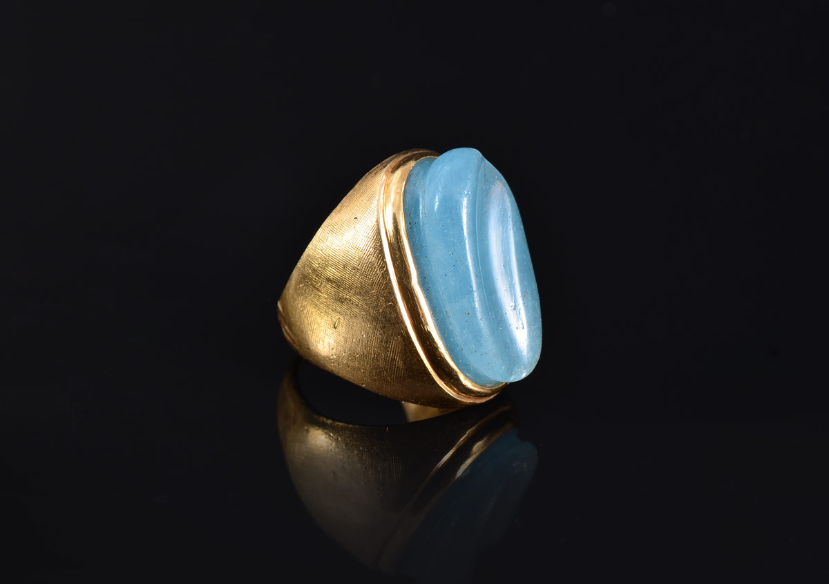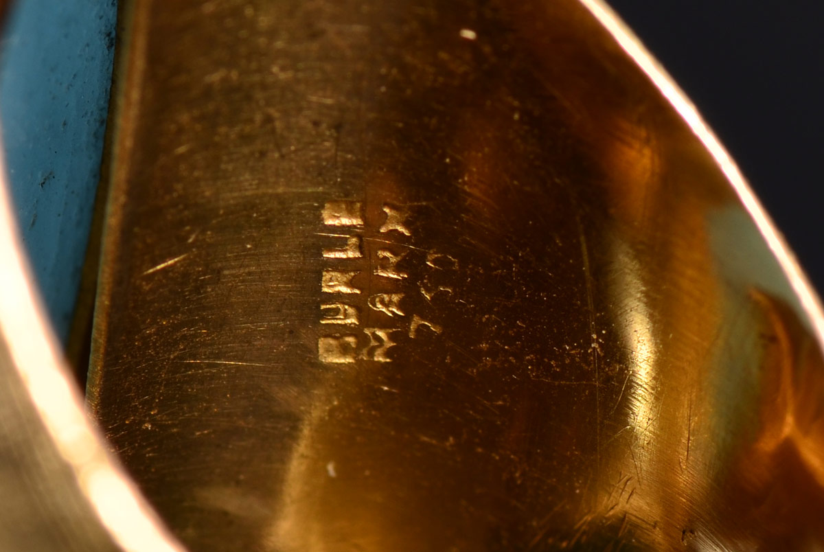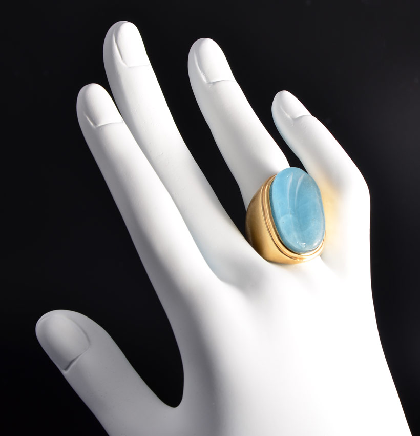 BURLE MARX POST MODERNIST RING: 18K yellow gold ring with the classic Burle Marx carved stone reminiscent of flowing water. Bezel set. Size 6.5. Impressed ''Burle MArx 750''. Weight 15.5 grams. CONDITION: One very small chip can be felt on the stone.