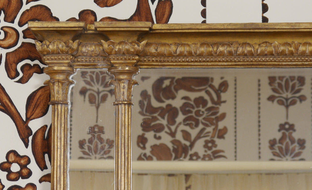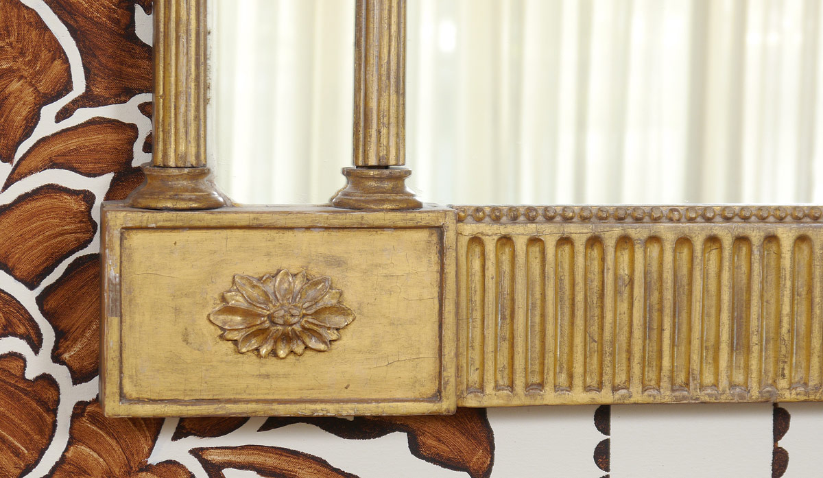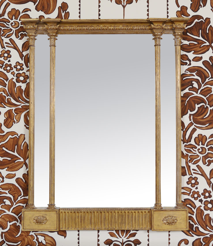 ENGLISH GEORGE III CARVED GILT WOOD MIRROR: Carved gilt wood decoration with fluted half columns. Applied decoration at base. 43'' h. x 34 1/2'' x 3 1/4''.