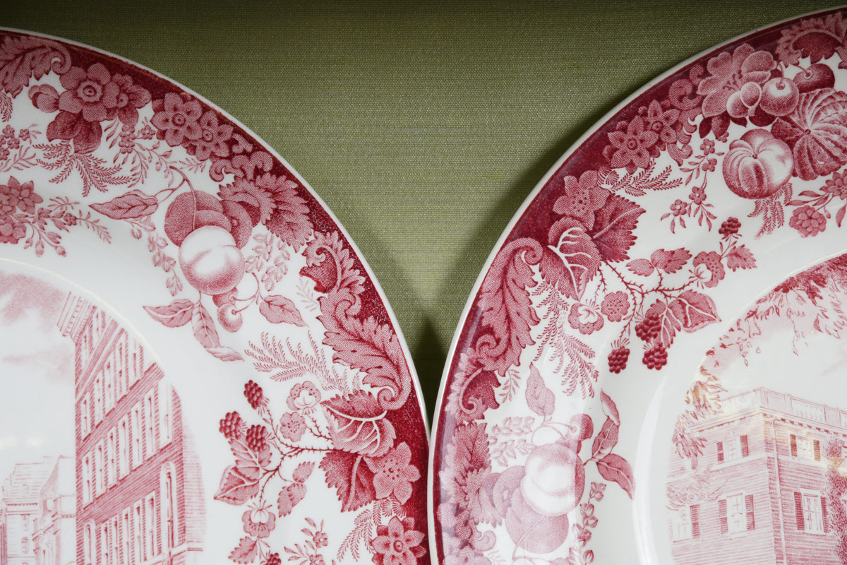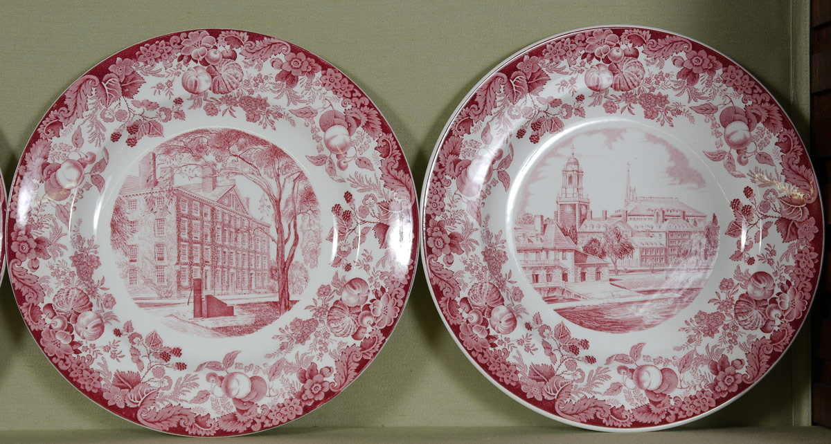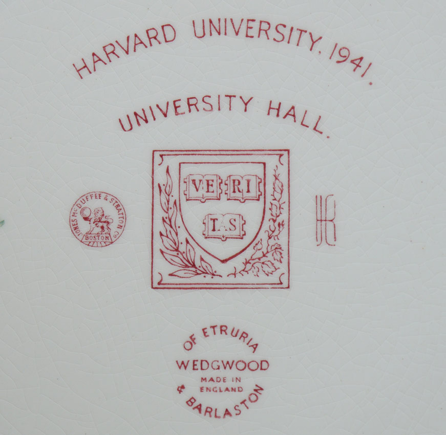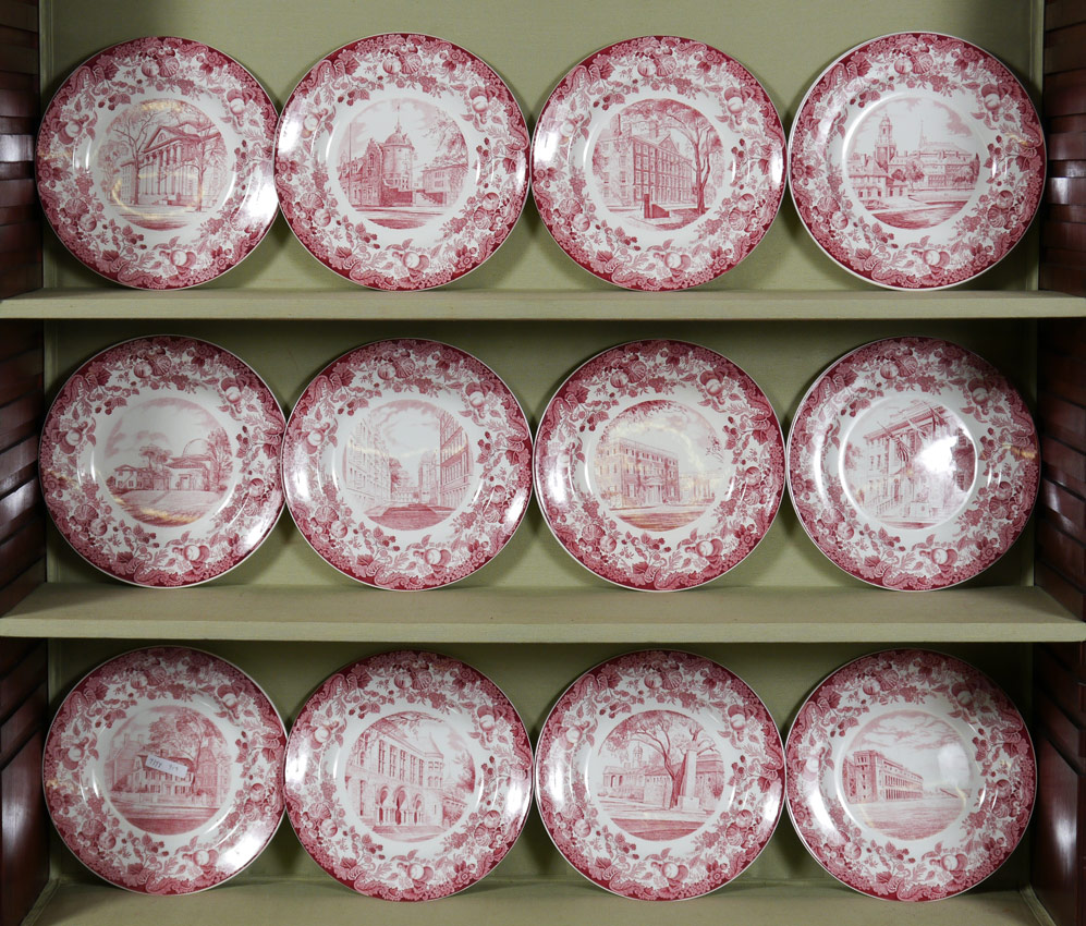 SET OF 12 WEDGWOOD HARVARD PLATES: Red transferware design depicting scenes at Harvard University. Measure 10 1/8'' dia.