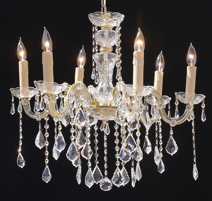 CRYSTAL CHANDELIER: Six light, bent arm crystal chandelier with crystal chains and faceted prisms. Measures approx. 22''h. x 25'' dia., excluding the chain.