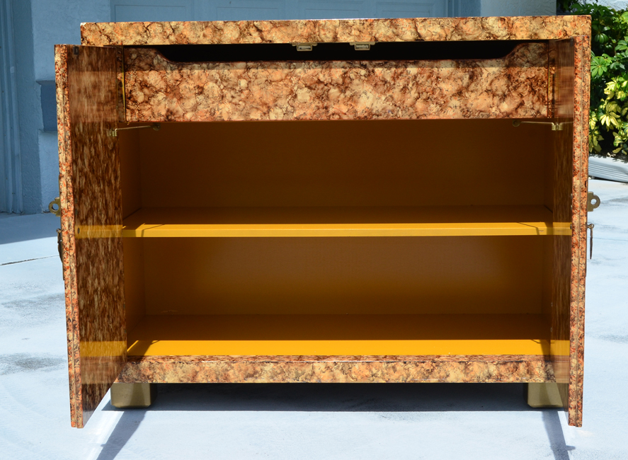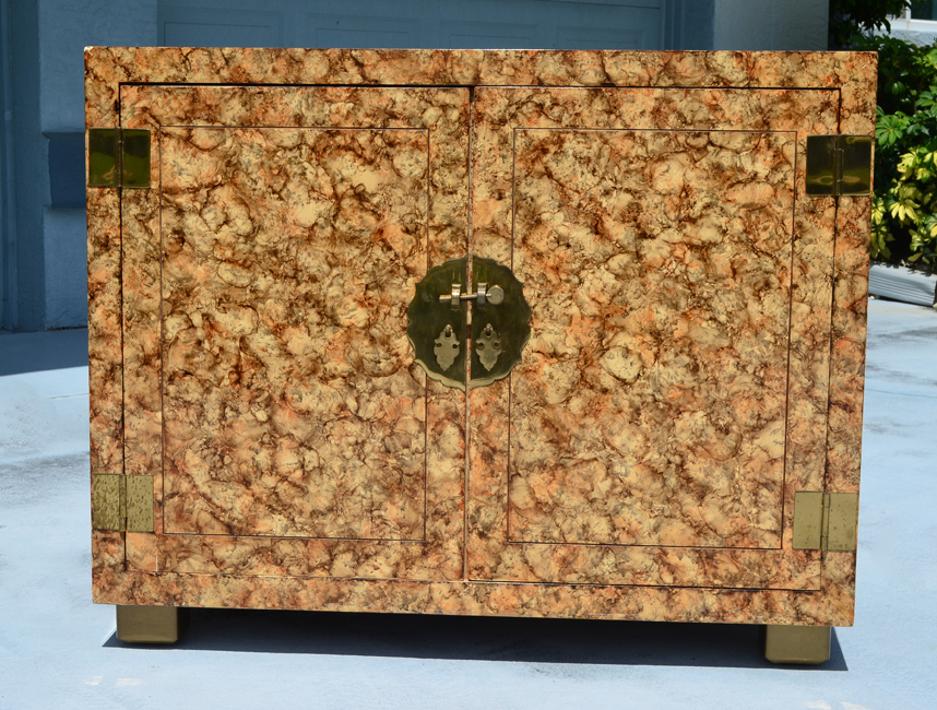 HENREDON OIL DROP FAUX TORTOISE SHELL CHEST: 2 door chest with faux tortoise shell design, doors with brass oriental style pulls. Interior with single drawer over shelf. 31'' h. x 39'' x 18''.