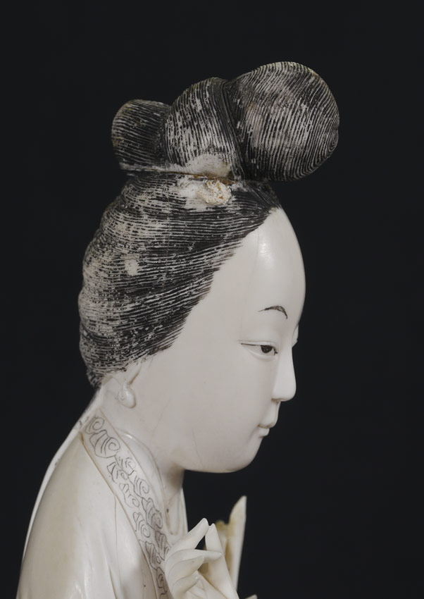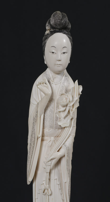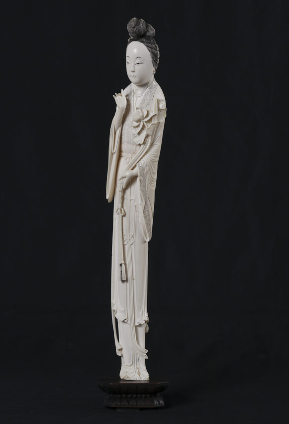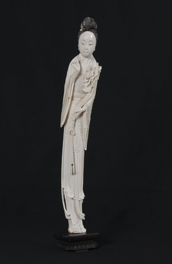 CHINESE CARVED IVORY FIGURAL WOMAN: Figure of a woman in robes holding a lotus blossom in hand. Affixed to wood base. Ivory 16 1/2'' h., base 1 1/4'' h. x 3 1/4'' x 3''. Sold with Lexan case with mirrored base, overall case measures 22'' h. x 5 1/4'' square.