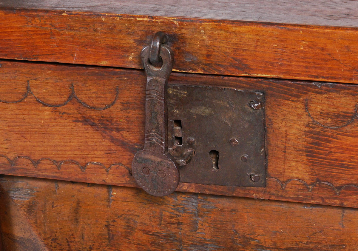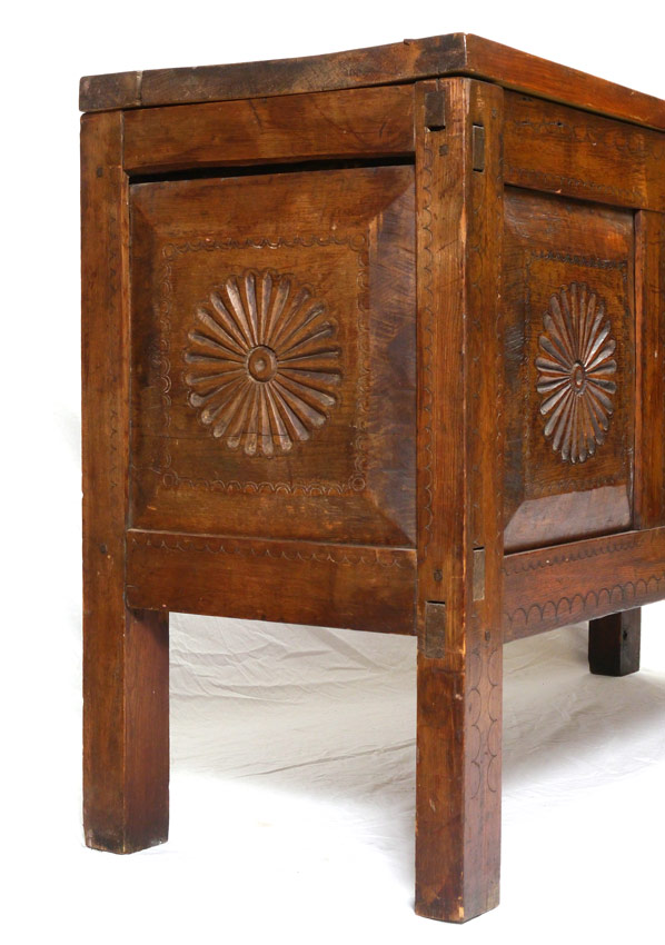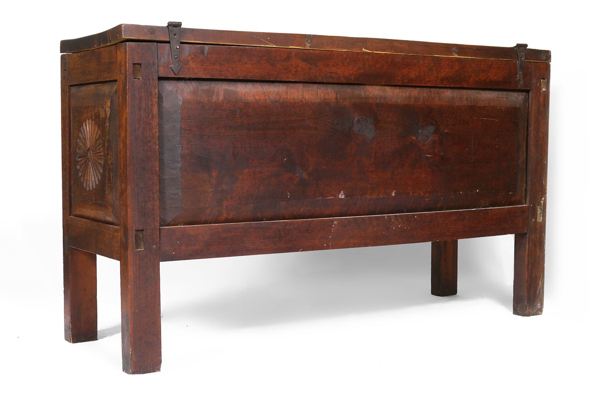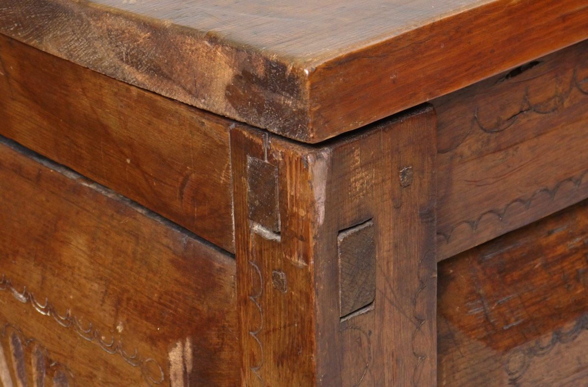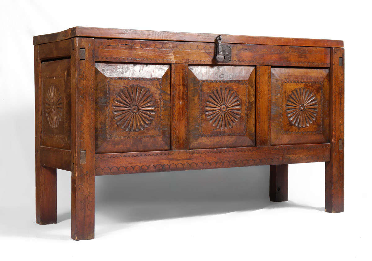 MEXICAN COLONIAL BLANKET CHEST: Hinged top with iron hardware. Carved paneled front and sides, through tenon construction. 39'' h. x 65 1/4'' x 21 3/4''.