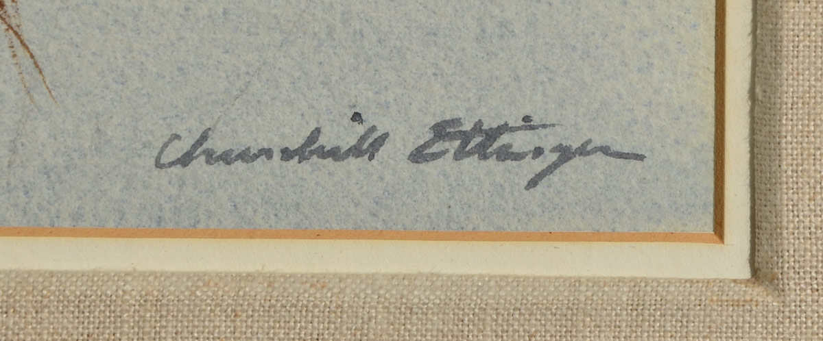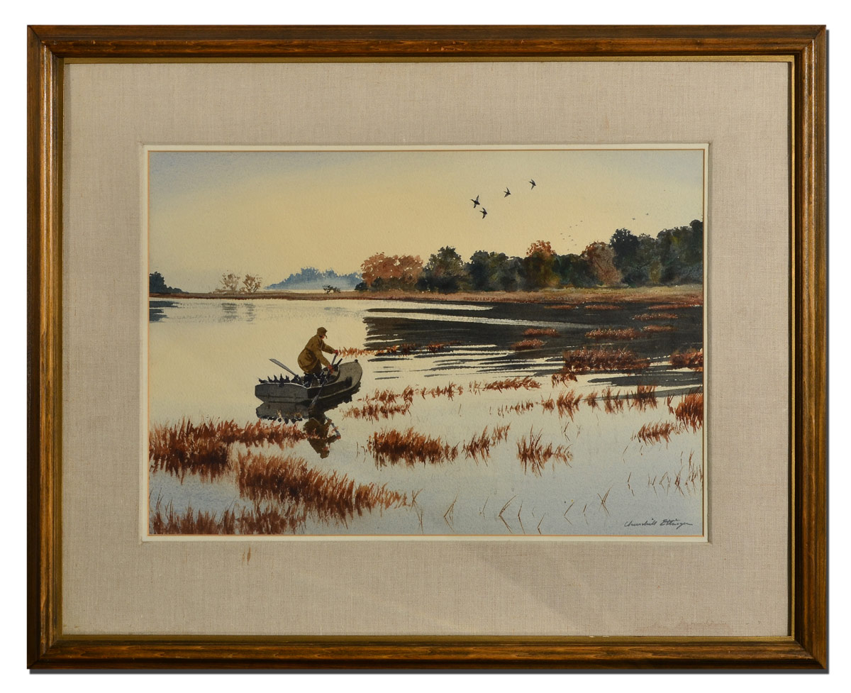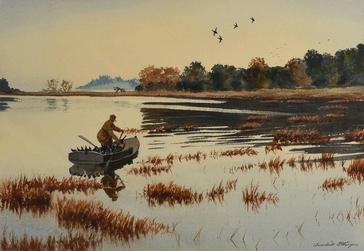 ETTINGER, Churchill, (American, 1903-1984): ''Early Arrivals'', Depicts a Hunter Rowing a Boat in the Marsh Viewing Ducks in Flight, Watercolor, Sight size 14'' x 20 1/2'', signed lower right, framed 24'' x 30'', titled verso and presented to Bo Adlerbert on his 75th Birthday by the Swedish Ski Club.