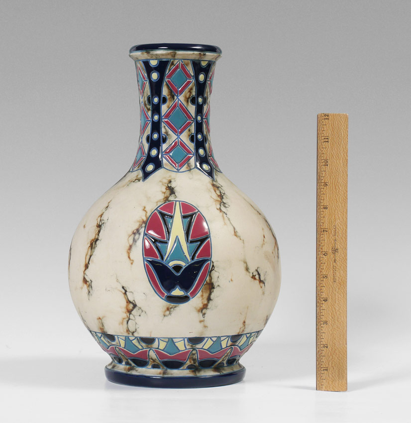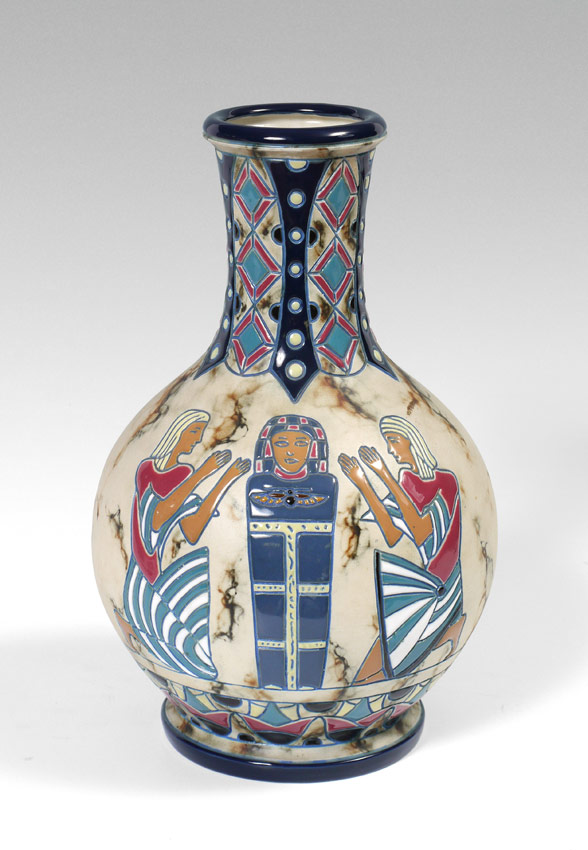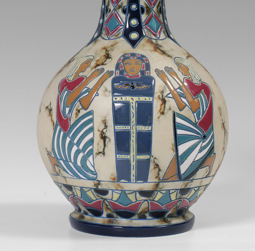 AMPHORA EGYPTIAN REVIVAL VASE: Circa 1918-1939, Amphora Works Riessner, green under glaze mark. 15'' h.