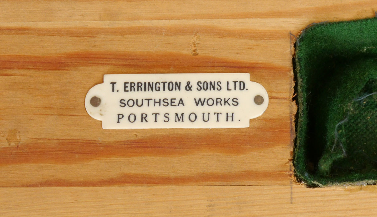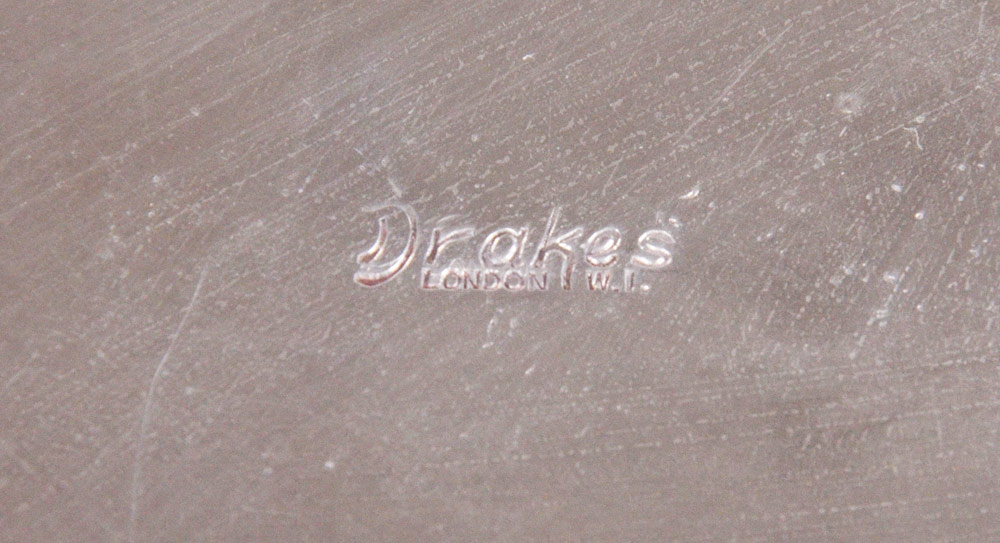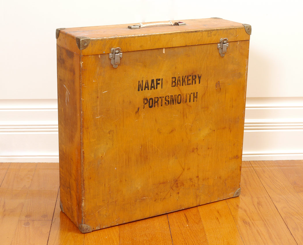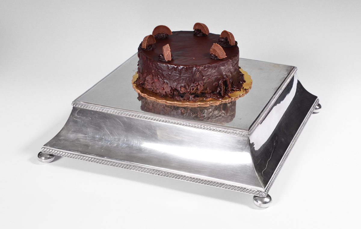 T. ERRINGTON & SONS SILVERPLATE CAKE PLINTH: A large cake plinth by Drakes, shaped sides on bun feet. 5'' h. x 18 3/4'' x 18 3/4''. Sold with original T. Errington & Sons retailer wood storage case. Marked outside of box Naafi Bakery Portsmouth. 23'' x 22 3/4'' x 7 3/4''.