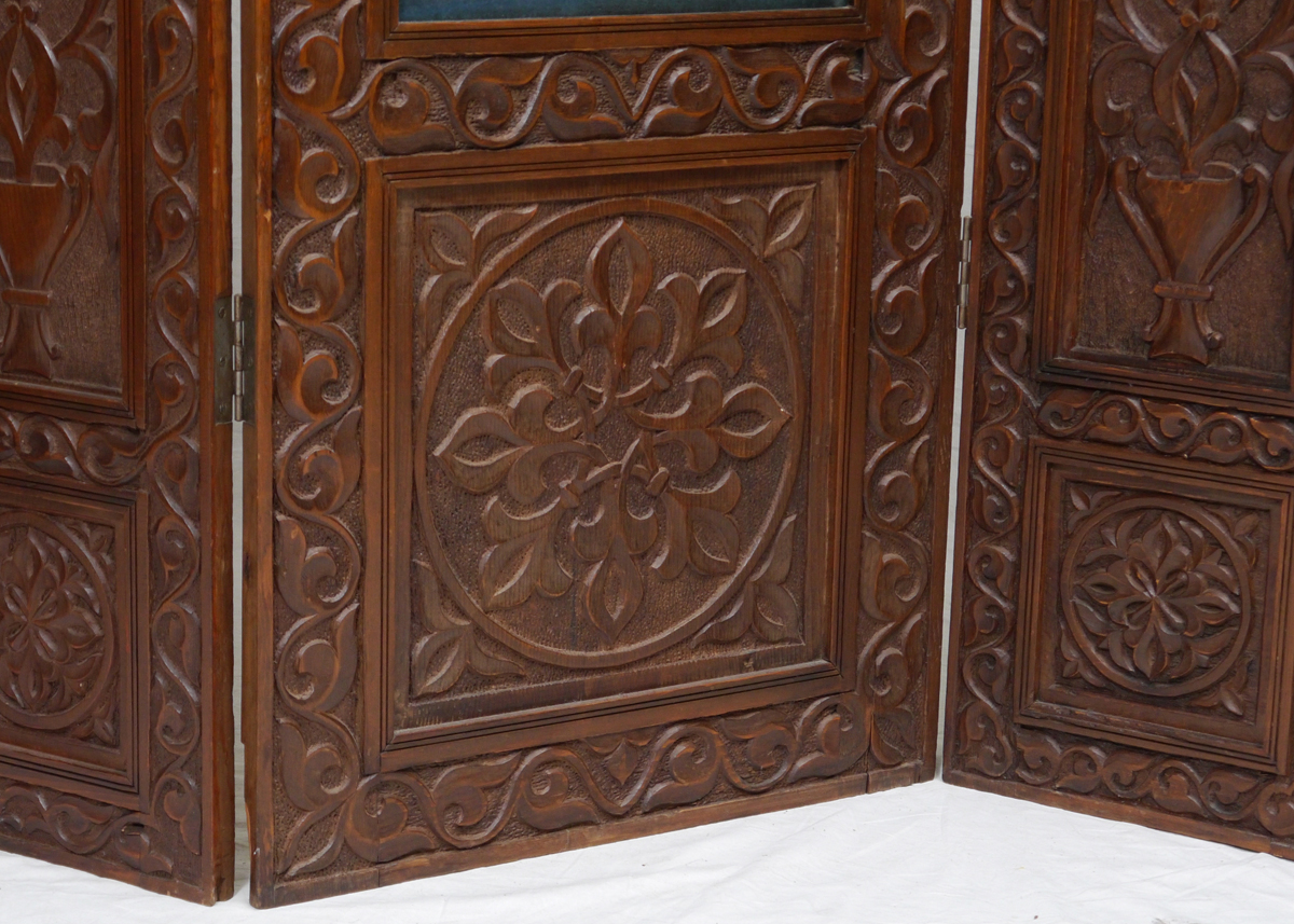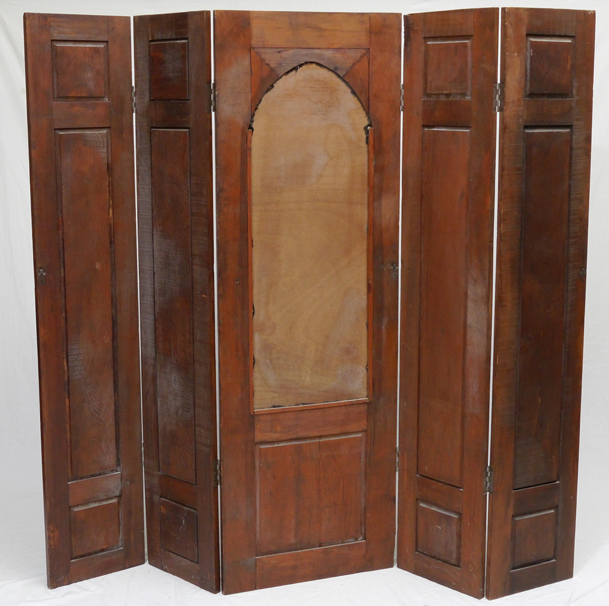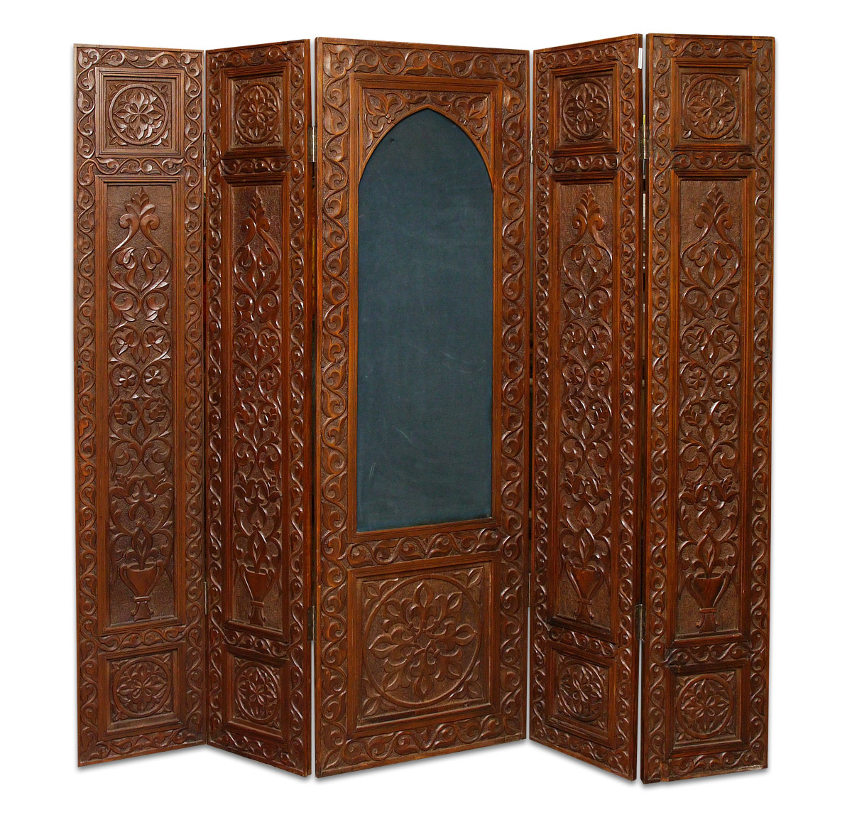 5 PANEL CARVED MOROCCAN SCREEN: Carved with middle eastern motifs, felt insert in center section. Center panel 64 1/2'' h. x 21 1/4''.