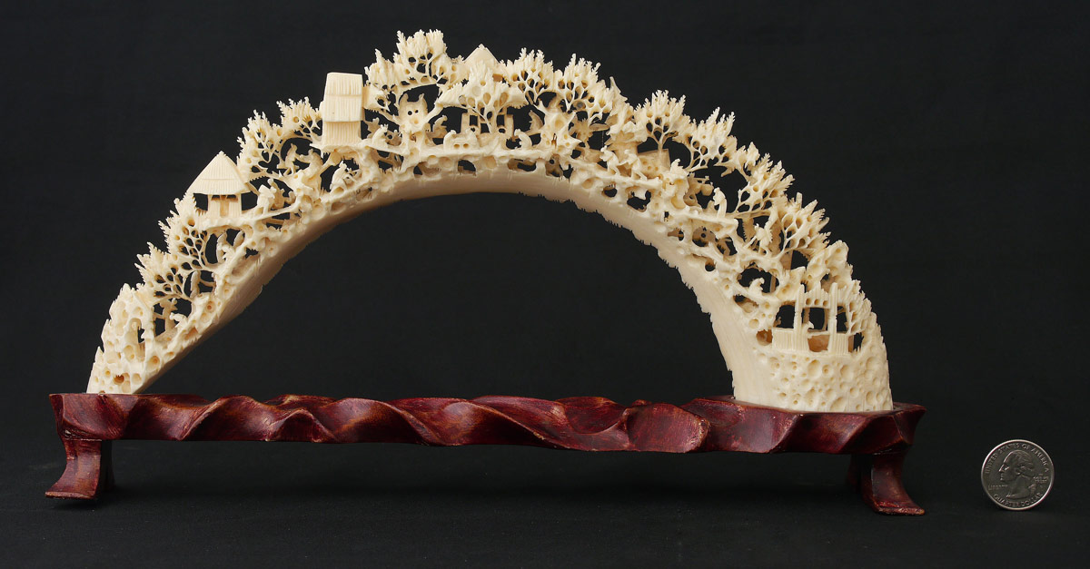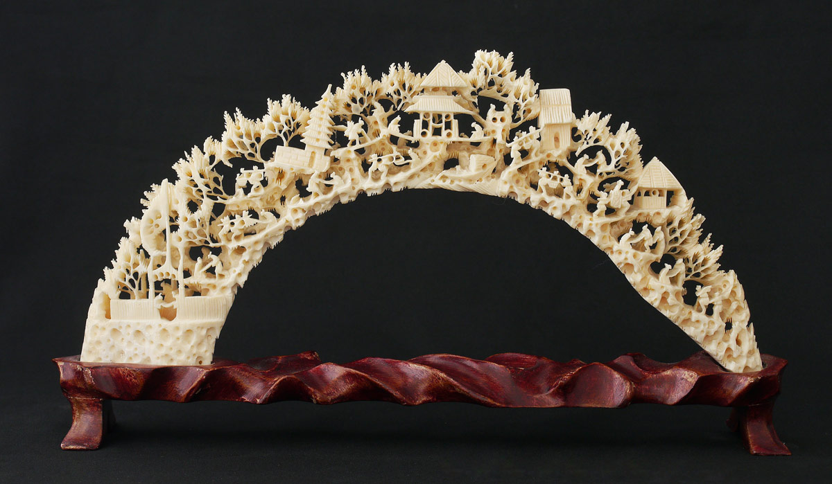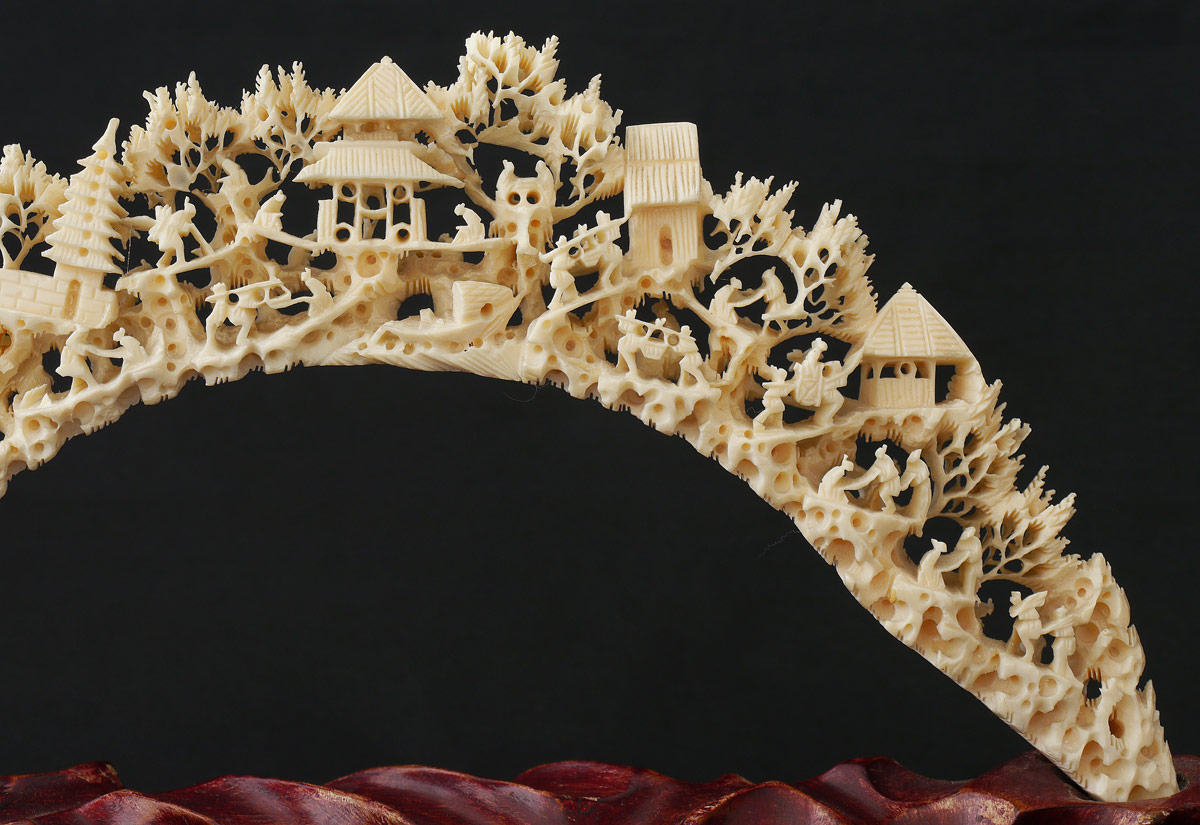 CHINESE CARVED IVORY TUSK: Pierced carved tusk with figures, landscape, and buildings motif. Affixed to carved wood base. Overall measures 6 1/4'' h. x 11 3/4''.