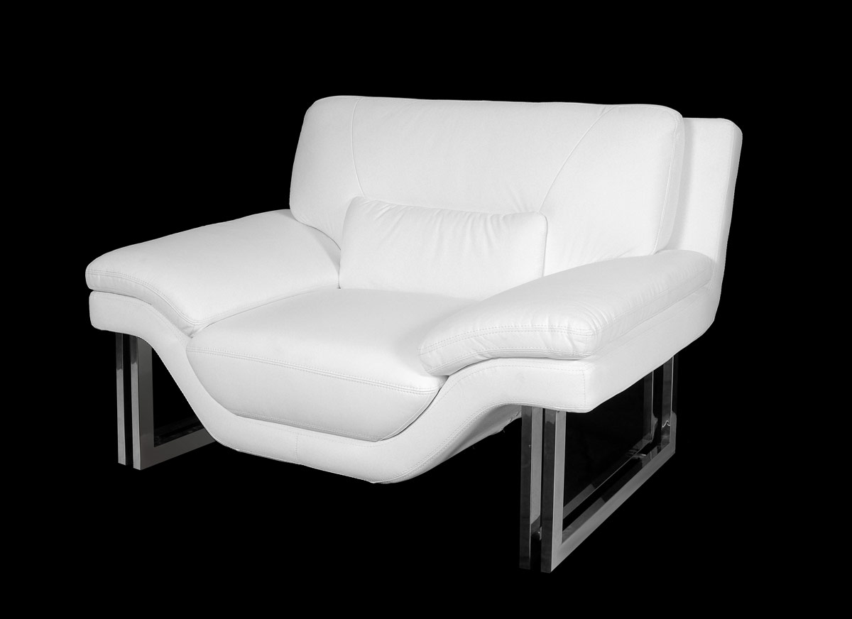 ITALIAN WHITE LEATHER MODERNE CHAIR: Stitched white leather upholstery on oversized shaped frame, on chrome legs. Overall 36'' h. x 51 1/2'' x 40''. Sold with a white fabric cover.