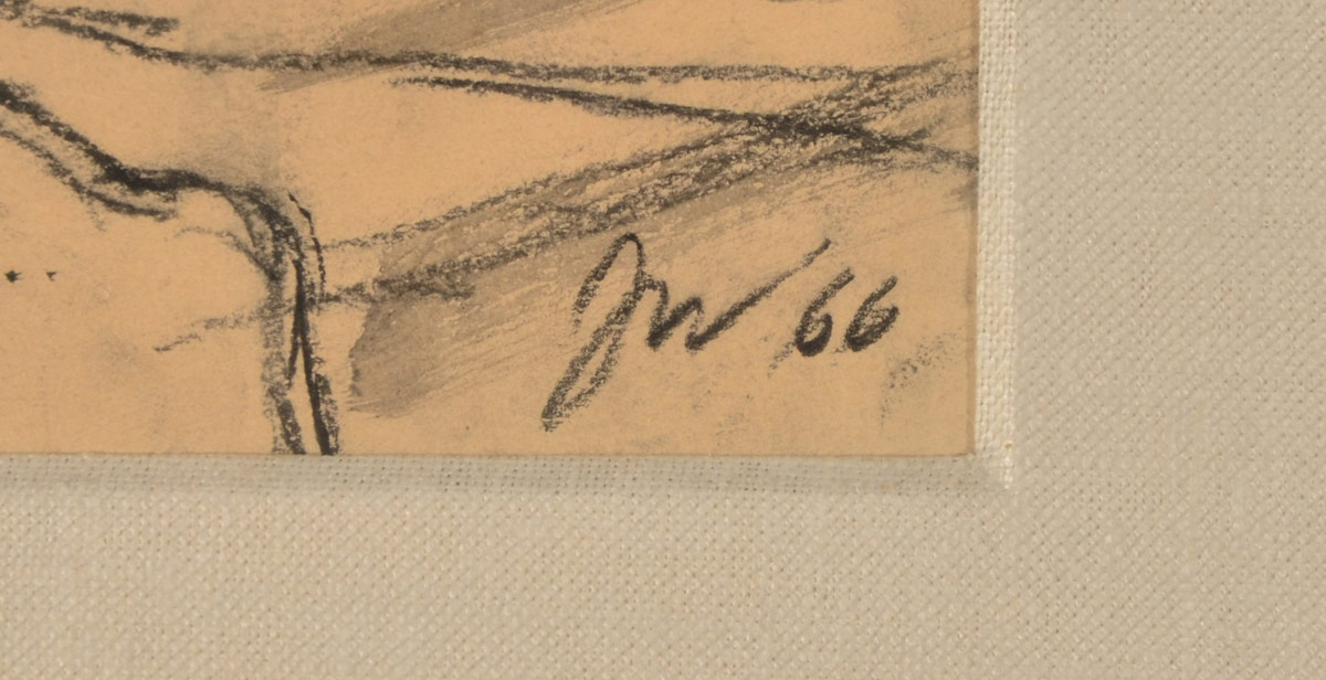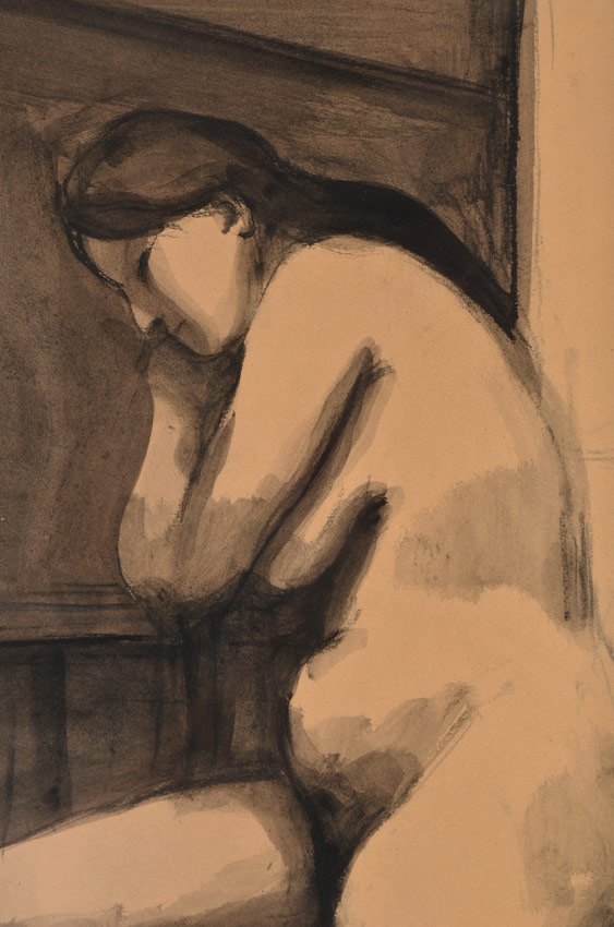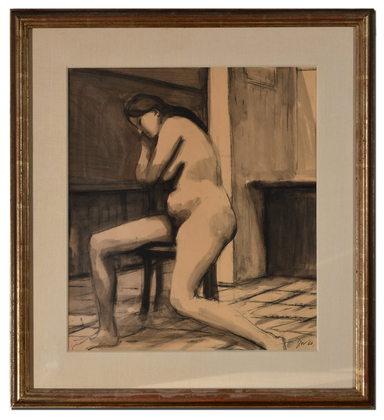 WEEKS, James (Darrell Northrup), (American, 1922-1998): Seated Nude Facing Right, Watercolor/Sepia and Charcoal, Sight size 19 3/4'' x 17 1/4'', monogrammed lower right JW, dated '66, vintage silver gilt frame with wear 28'' x 25 1/2''.
