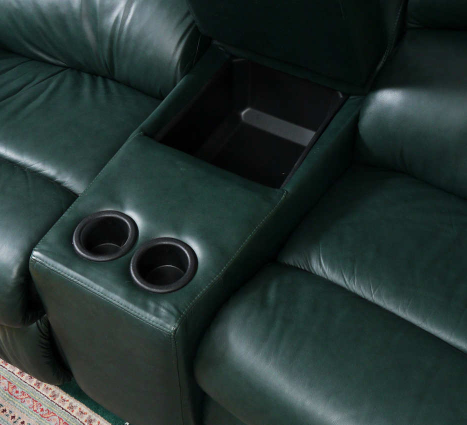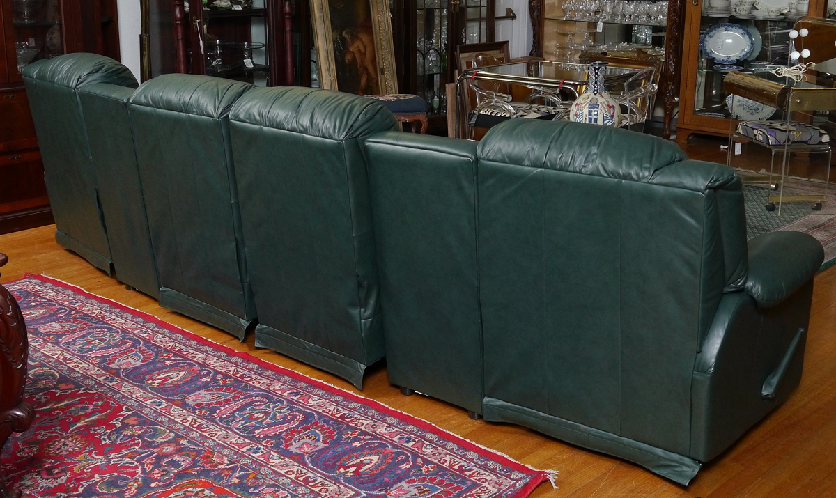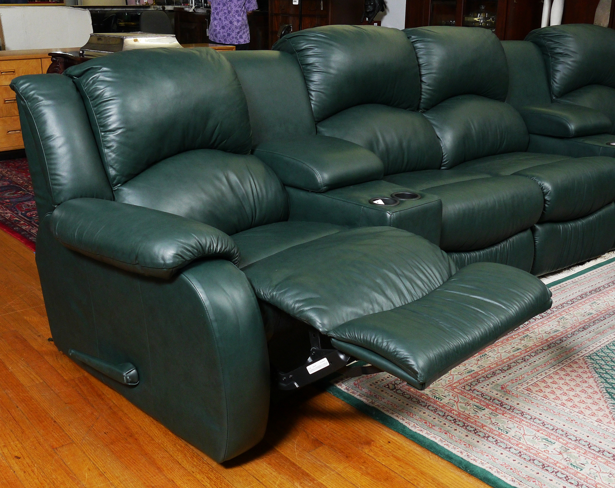DAKOTA LEATHER HOME THEATER SEATING: 4 recliners and 2 sections for drink holders make up the 6 section spruce green leather sectional sofa. Measures approx. 12 ft. Original purchase price, $4000.00.