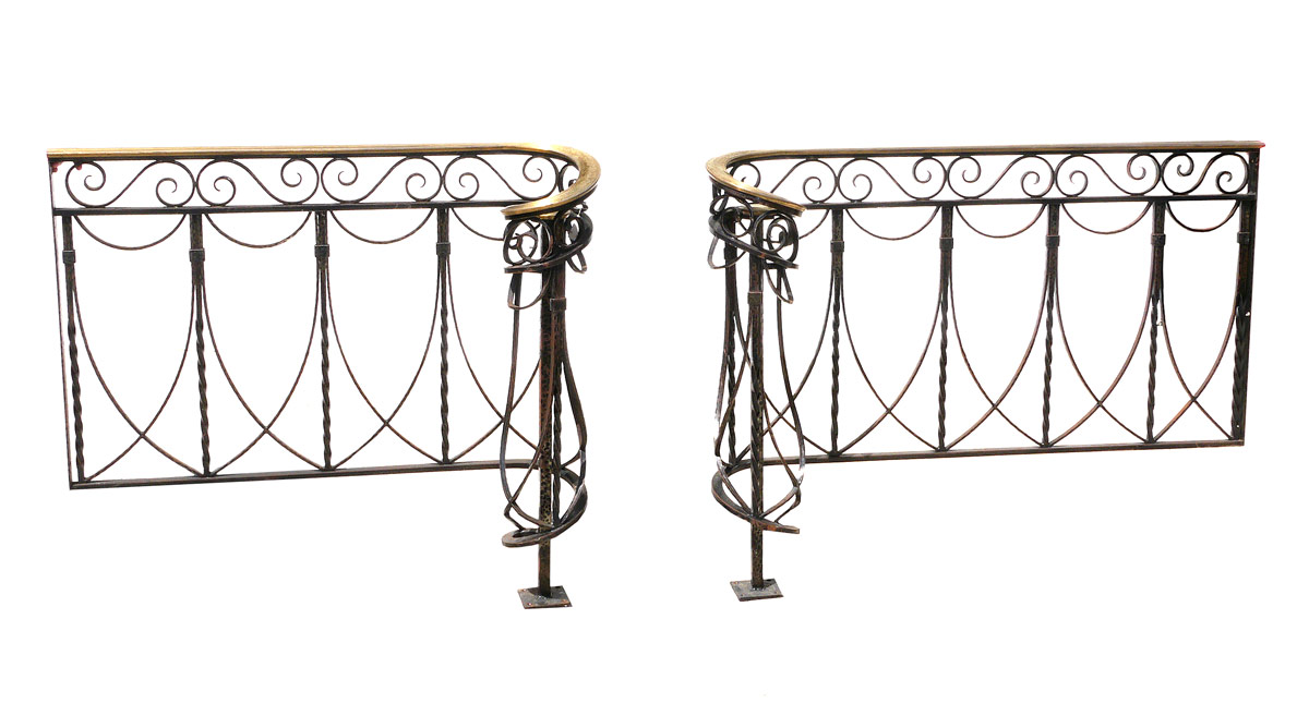 PAIR 1930'S BRASS AND WROUGHT IRON STAIR RAILINGS: One 43 1/2''l., one 51 1/2''l., both 37 3/4''h., 10 3/4'' dia. swirl handle, 10'' from bottom to ground. Measurements are approx.