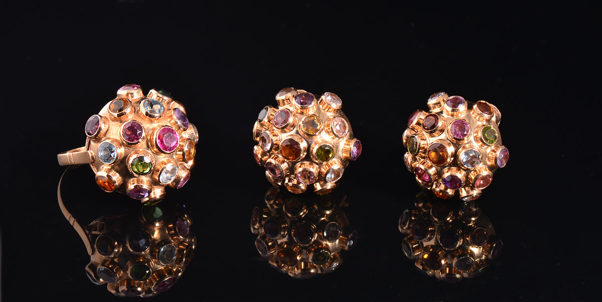 18K GOLD MULTI GEMSTONE ''SPUTNIK'' STYLE RING AND EARRINGS: Ca. 1950's. 18K rose gold ''Sputnik'' ring and earring set with multicolored bezel set gemstones. Weight: 12.2 grams. Ring is size 8. Earrings are .75'' dia. Hinged clip closures.
