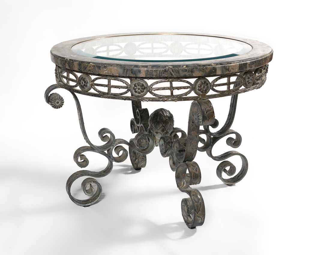 MODERN IRON BASE SIDE TABLE: Top with marble rim and beveled glass insert. Shaped iron base with pineapple finial. 22 3/4'' h. x 32 1/2''. See matching coffee table previous lot 1256.