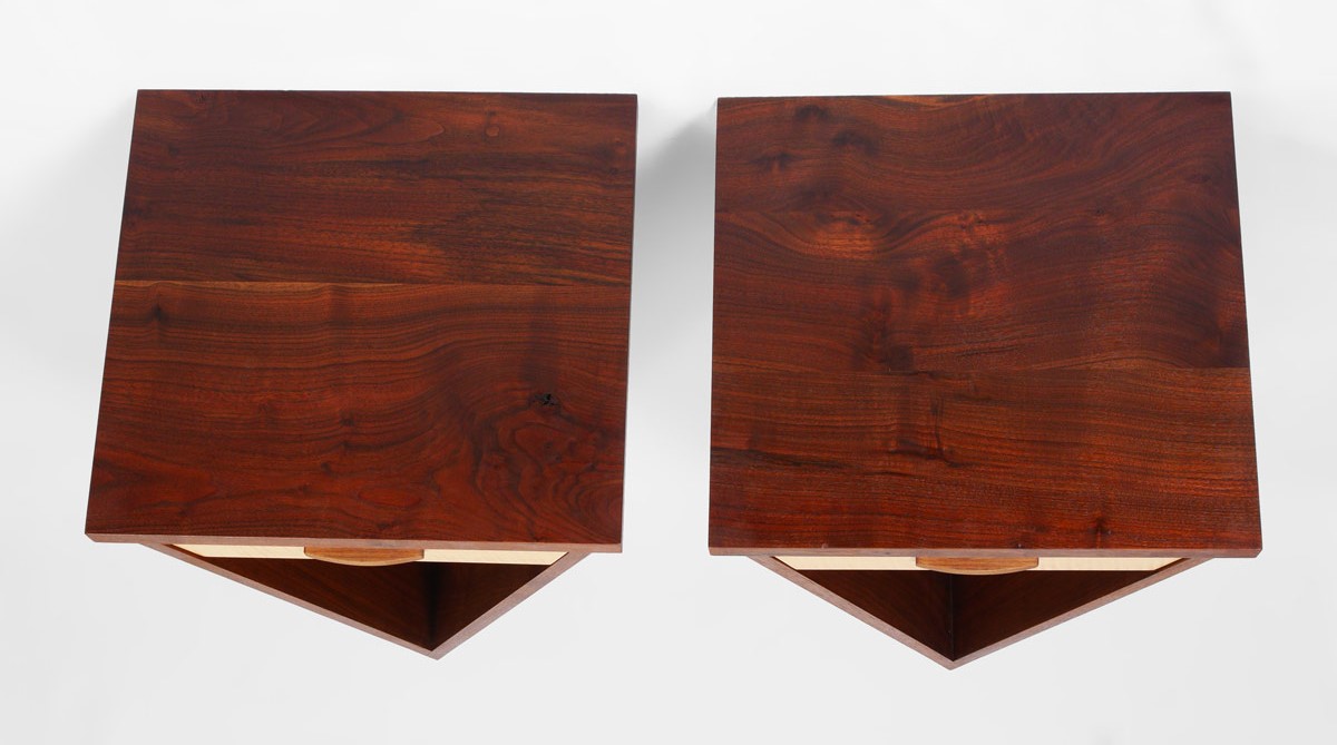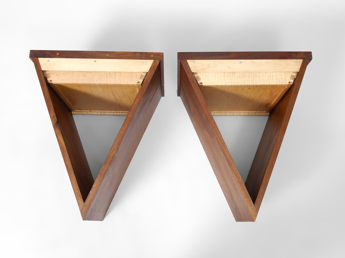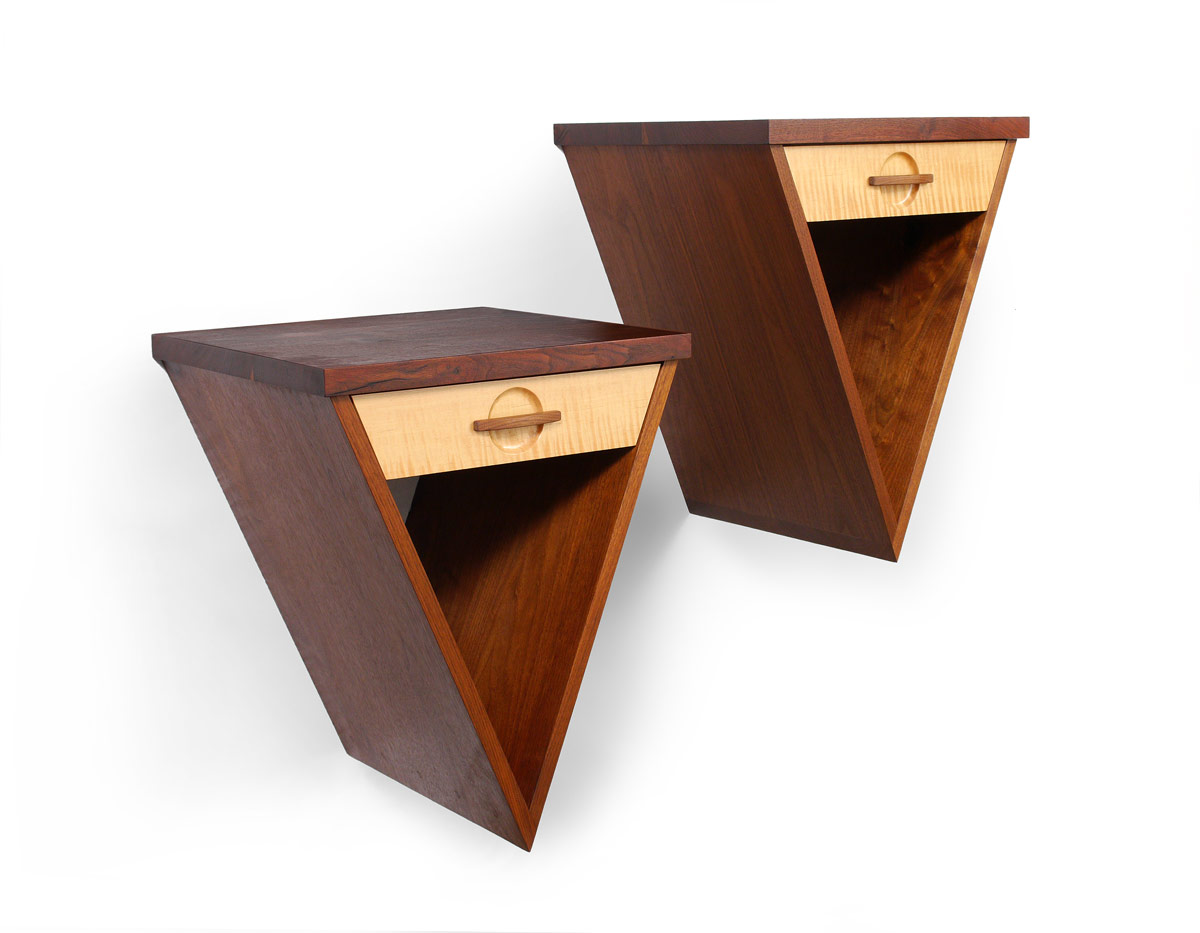 PAIR SEAN MCKENZIE ''V'' NIGHTSTANDS: Unique hanging wall nightstands in a V shape by designer Sean Mckenzie. Single drawer on each. Overall measure 25'' h. x 20 1/2'' x 19''.