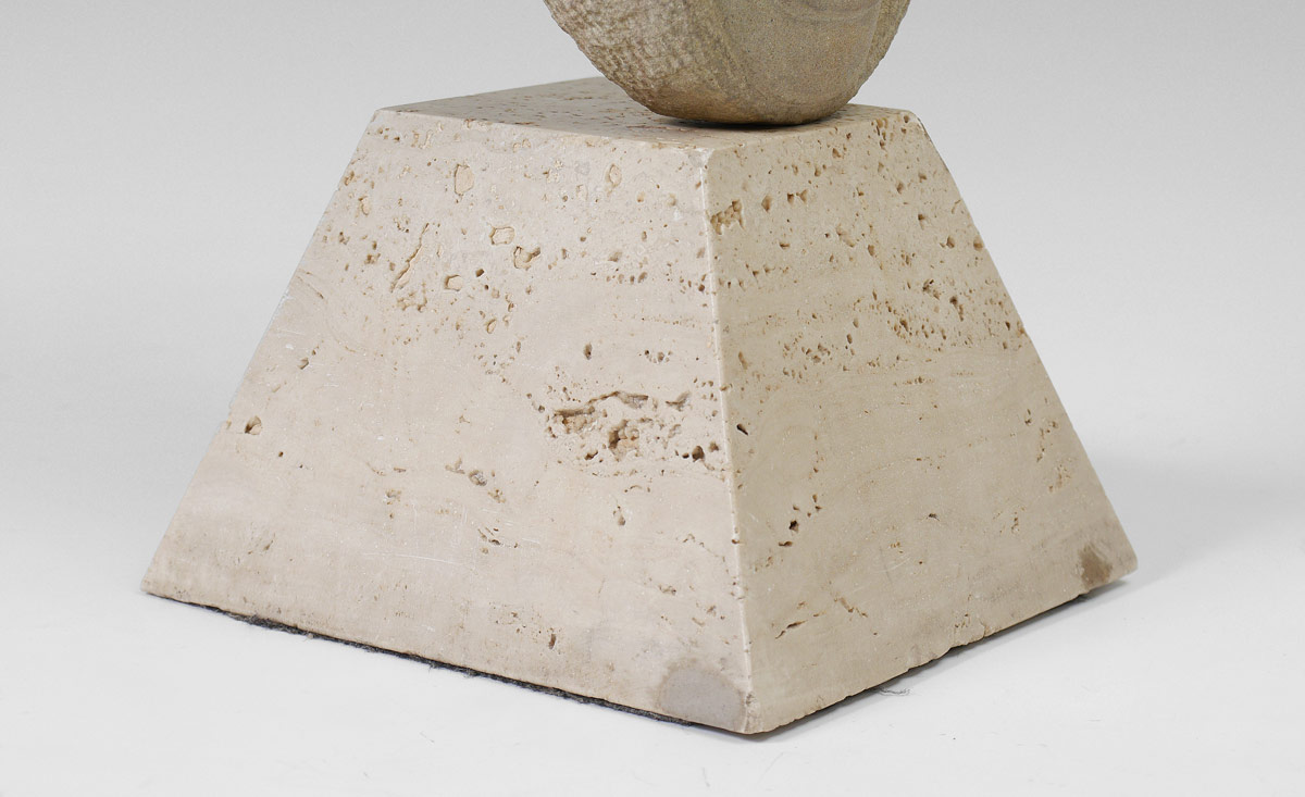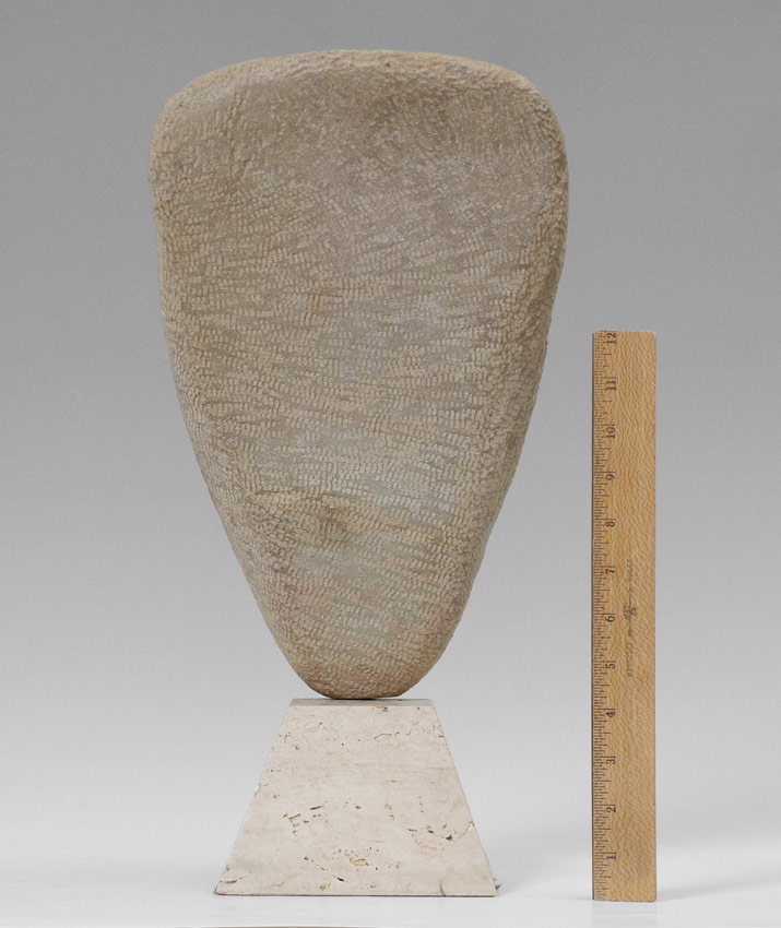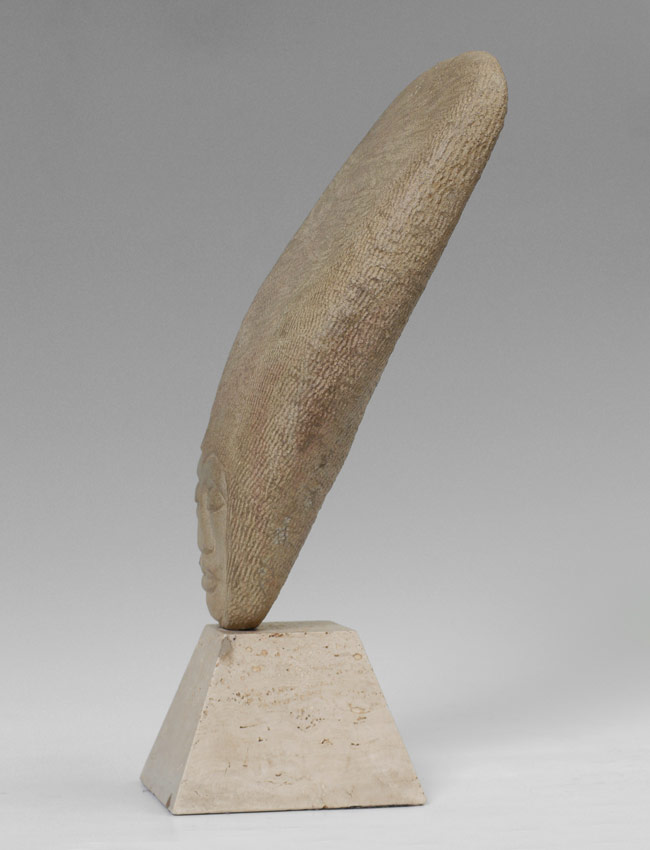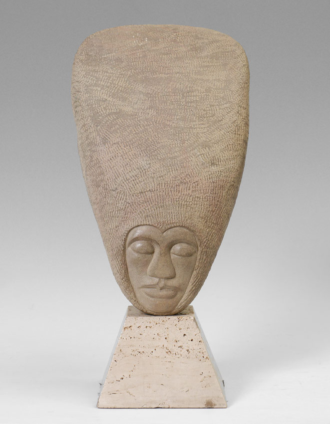 INUIT ESKIMO STONE BUST CARVING: Carved Stone measures 13'' h., affixed to a travertine base.