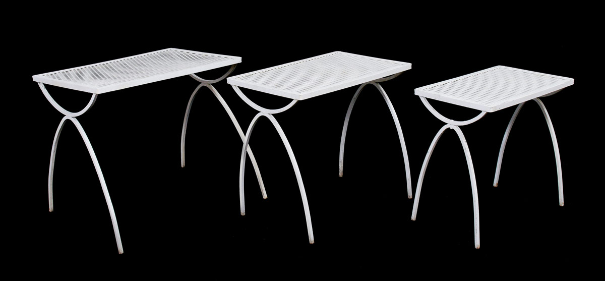 SALTERINI IRON OUTDOOR ROCKER & NESTING TABLES: Designed by Maurizio Tempestini for Salterini, with diamond pattern to include rocker (28 1/4'' h. x 30'' x 33''), 3 stack nest of tables (18 1/2'' h. x 14 1/2'' x 20 1/2'').