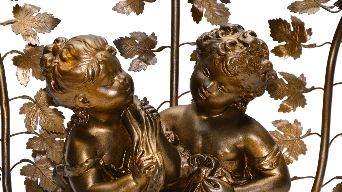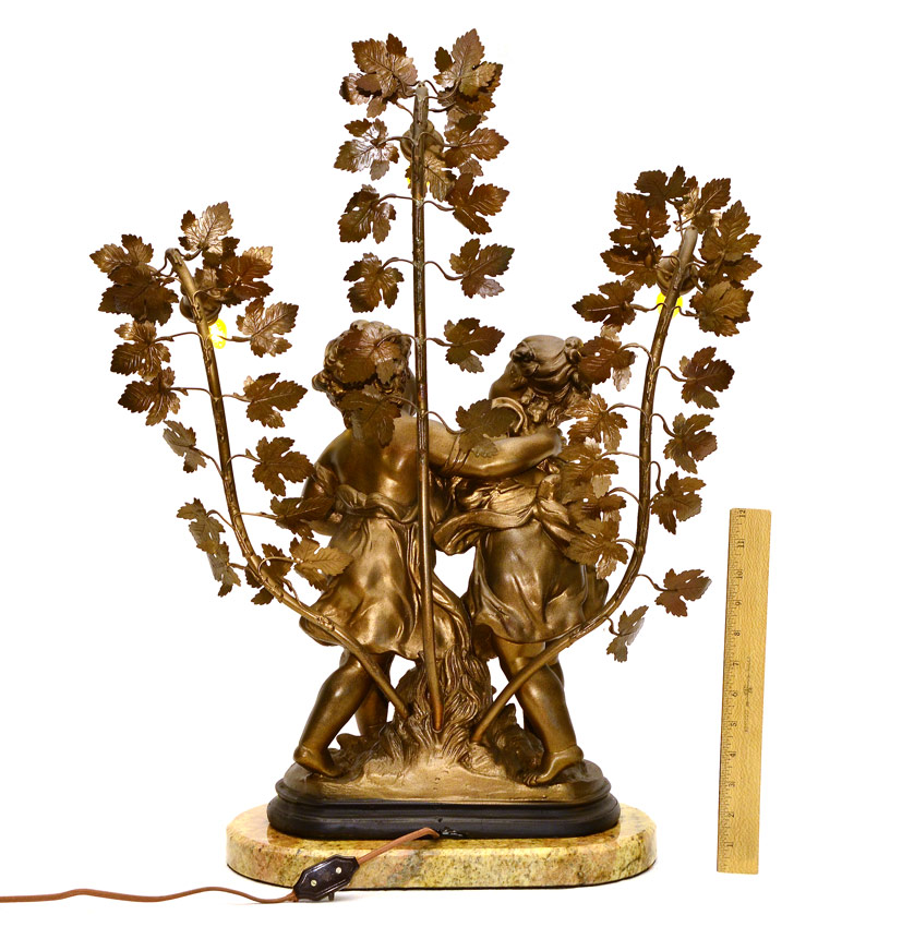 LARGE BRONZED FIGURAL LAMP: 3 light figural lamp of 2 frolicking children, mounted on marble, recent bronzed finish. Measures 28'' tall x 22'' wide.