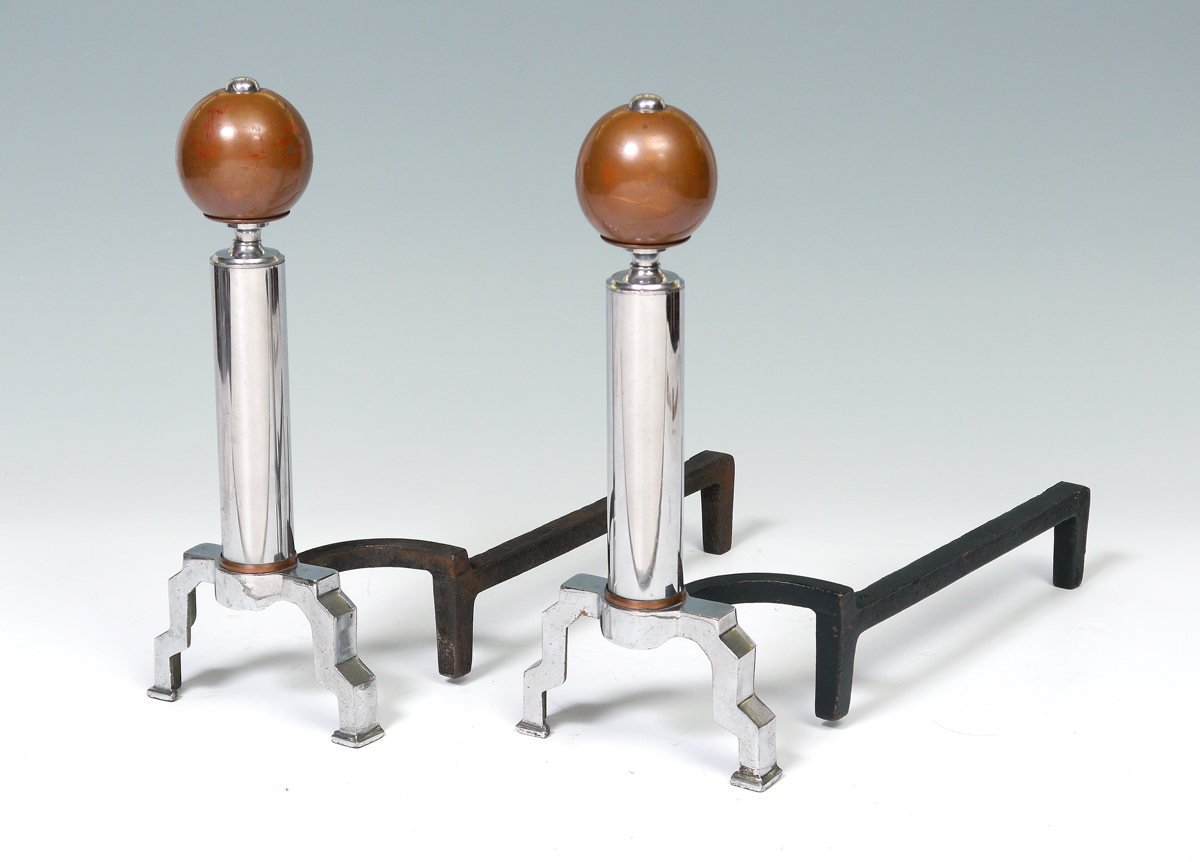 1930'S ART DECO ANDIRONS: Pair of andirons with chrome stepped feet, cylindrical body and copper ball finials. Cast iron dogs. Overall measure14 3/4'' h. x 6 1/4'' x 16 3/4''