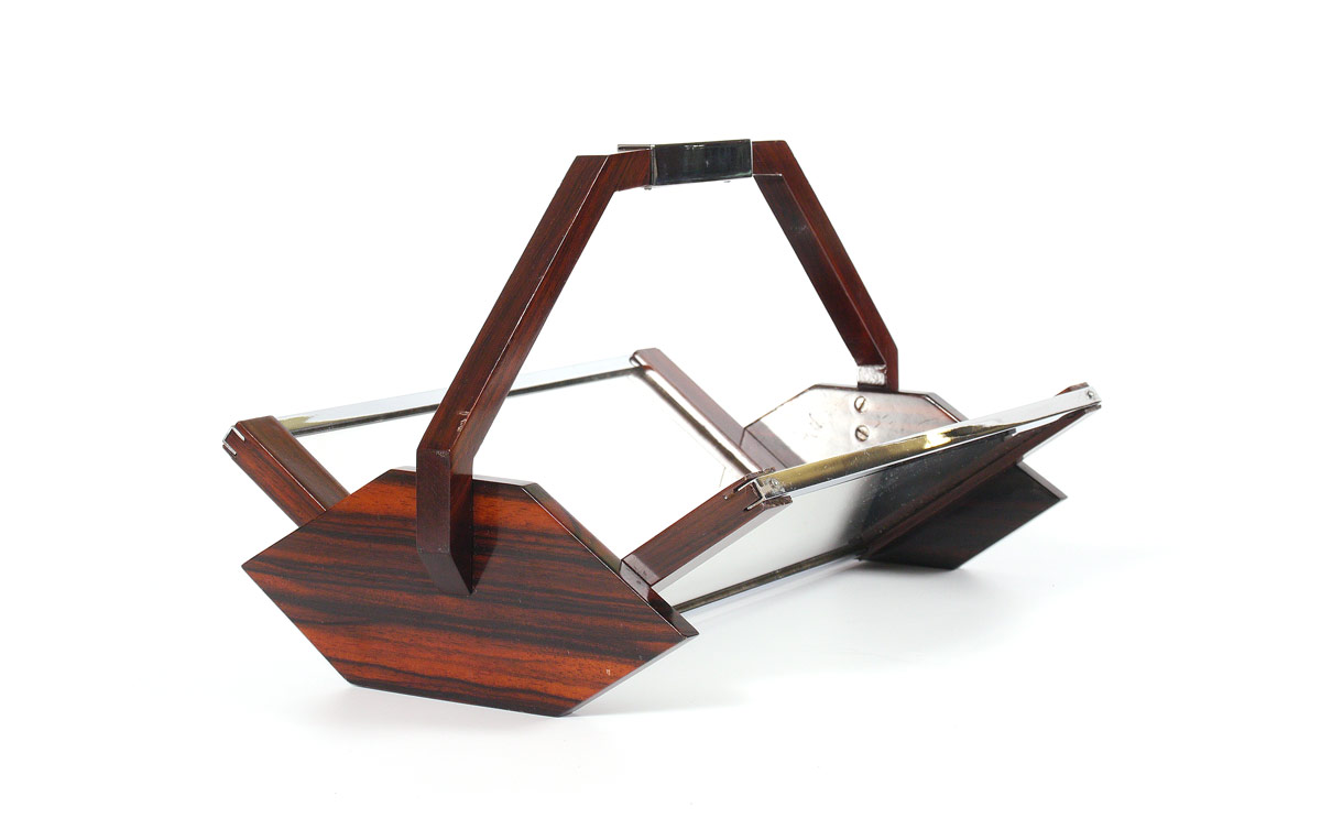 MACASSAR ROSEWOOD MIRRORED BASKET: Unique basket constructed from Macassar rosewood and sides mirrored on both inside and outside. Overall measures 7'' h. x 13 3/4'' x 8 1/2''