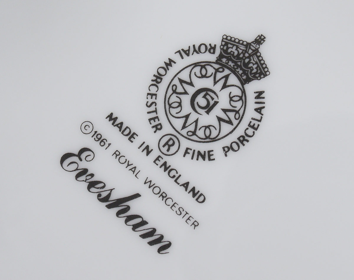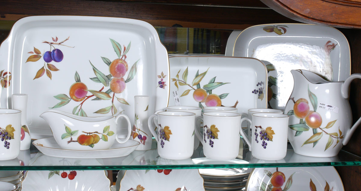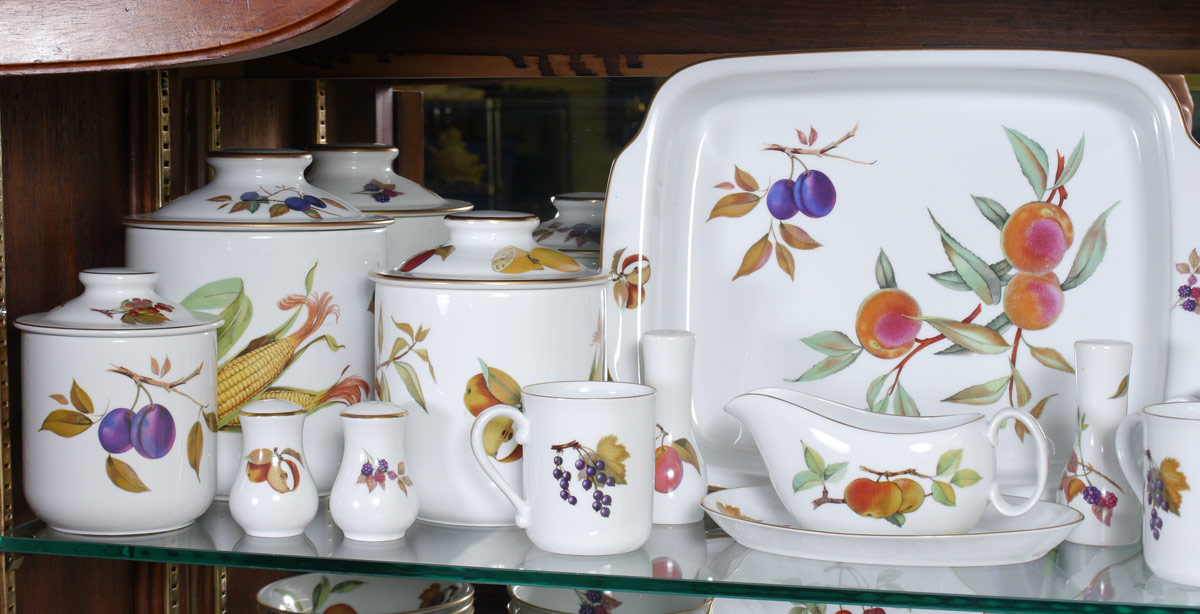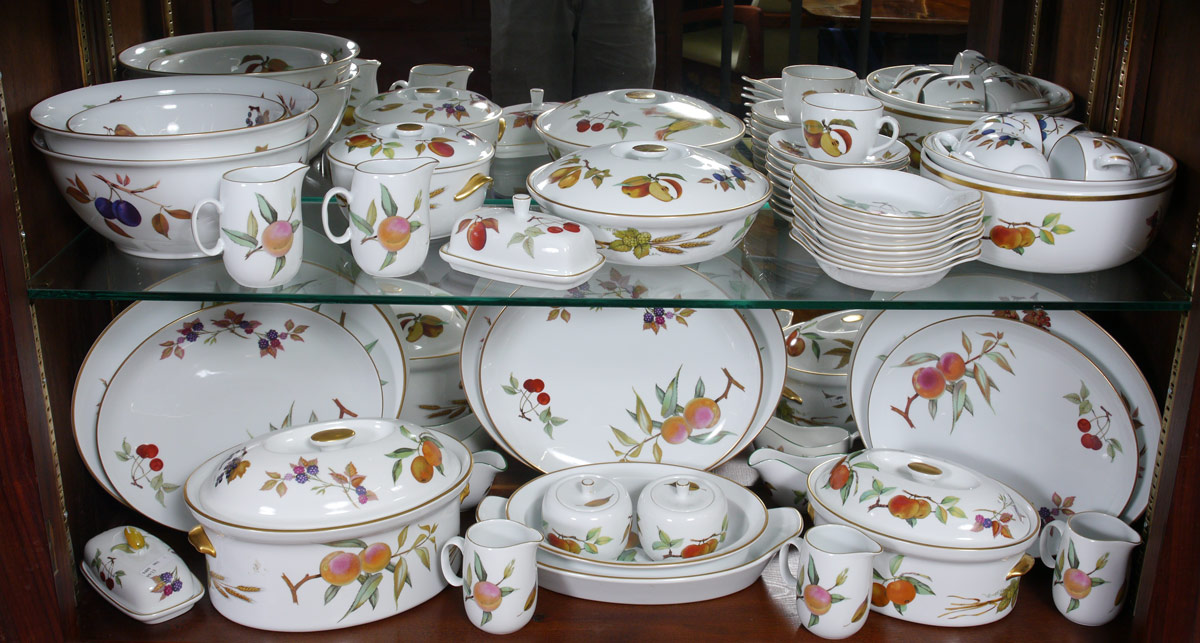 HUGE ROYAL WORCESTER EVESHAM GOLD CHINA: Approx. 195 pieces to include 16 dinner plates (10''), 16 salad plates (8.25''), 16 bread plates, 12 low soup bowls, 8 cereal bowls, 12 coupe bowls, 12 dessert bowls, 8 cups, 8 saucers, 16 mugs, 4 platters (12.5'' & 14.5''), 2 chop plates (12.5'' & 14''), 2 covered serving bowls, 8 assorted open serving bowls (9''-11''), 2 sauce boats, gravy with underplate, 2 covered butter, 3 baking dishes (square & rectangular), 6 cream pitchers, 2 covered sugar, mustard, 2 tall shakers (7.75'') 2 pair shakers (3''), 8 ramekins, 8 custards, 8 large shell dishes, 8 smaller shell dishes, 8 individual baking dishes, a 7'' pitcher, and a set of 3 graduating canister. Many pieces are freezer to oven to plate.