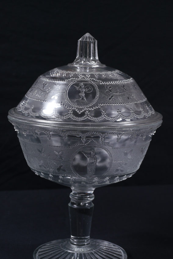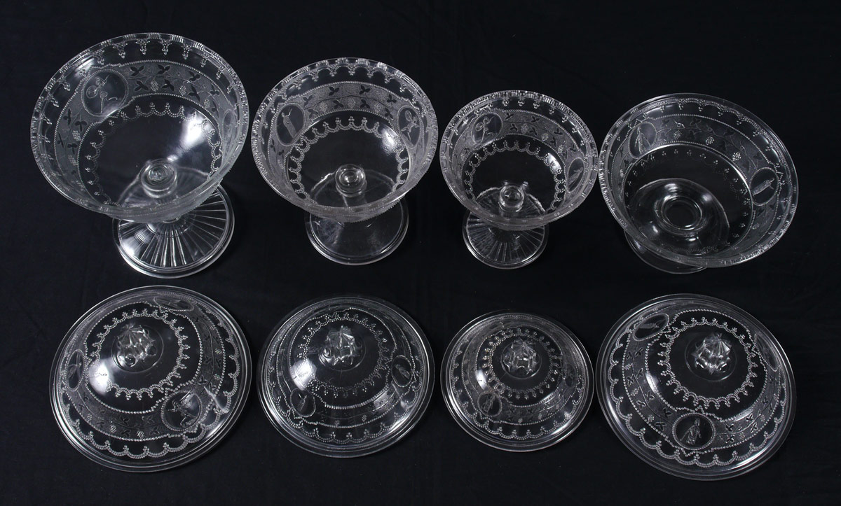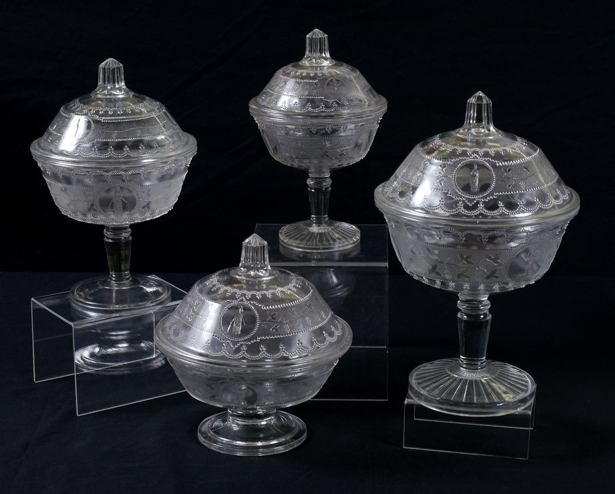 4 EAPG MINERVA COVERED COMPOTES: 19th C. glass compotes in the Minerva pattern. Covered bowls on tall stems, range in size from 9''-11'' tall and 6-8'' dia.