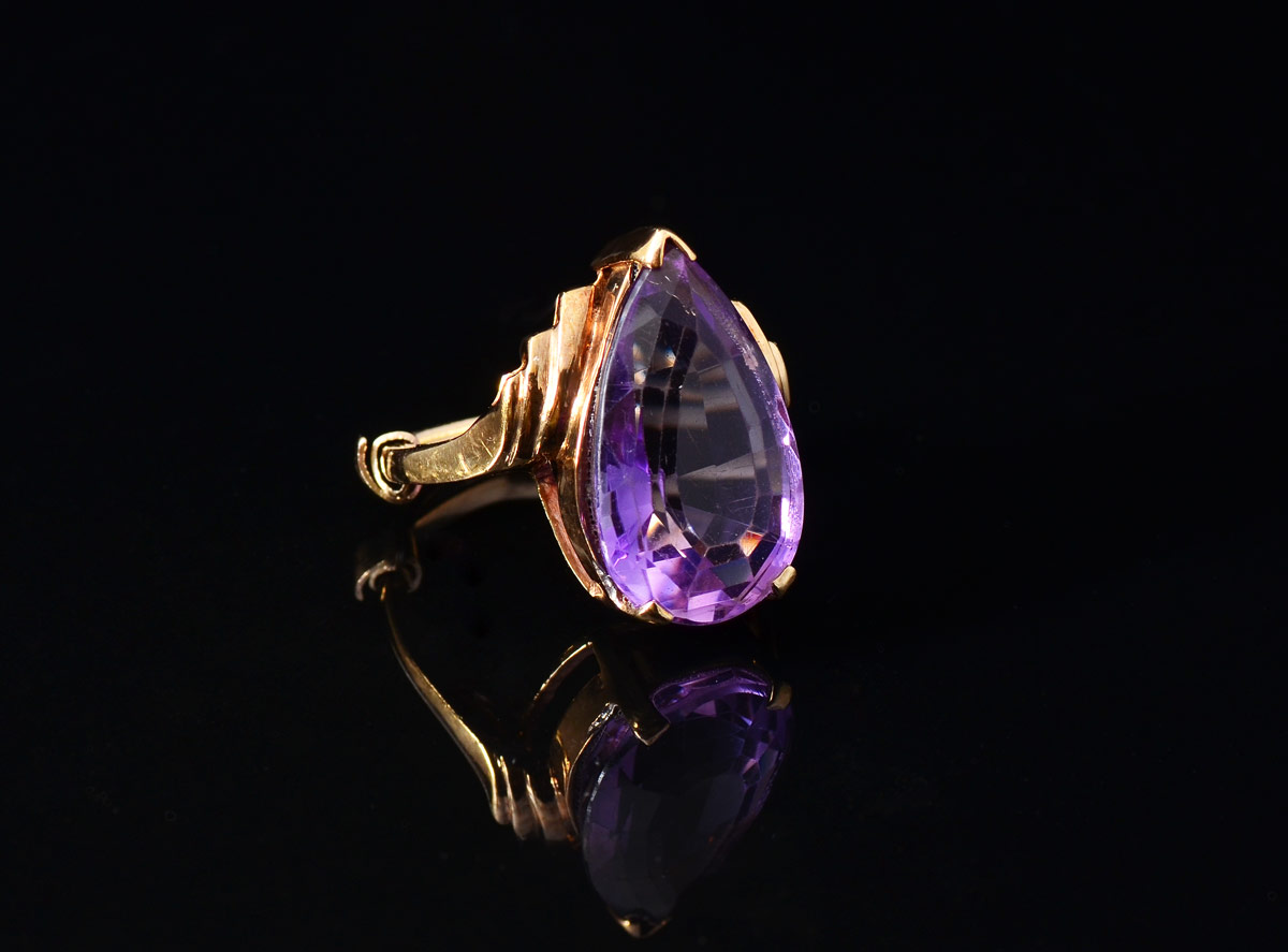 AMETHYST RING: 10K yellow gold ring with a 5 Ct pear shaped amethyst. Prong set. Weight 6.1 grams. Size 6.