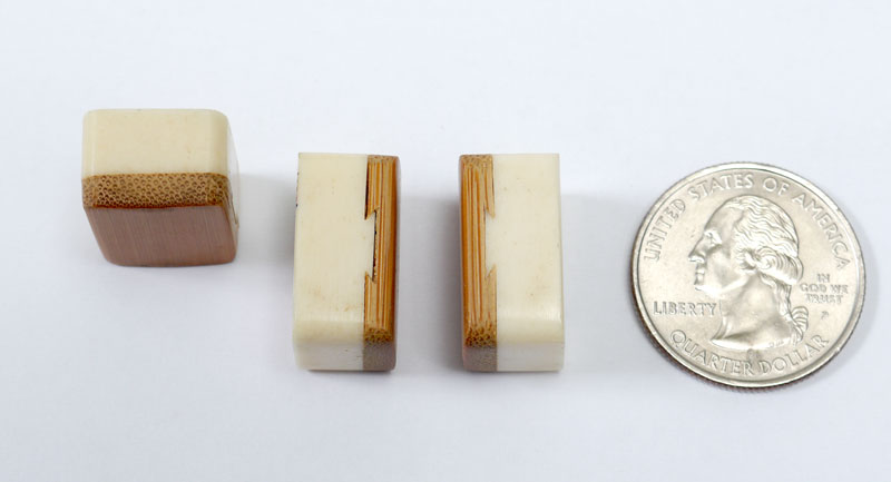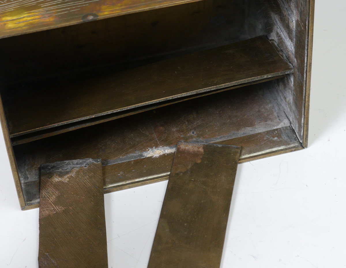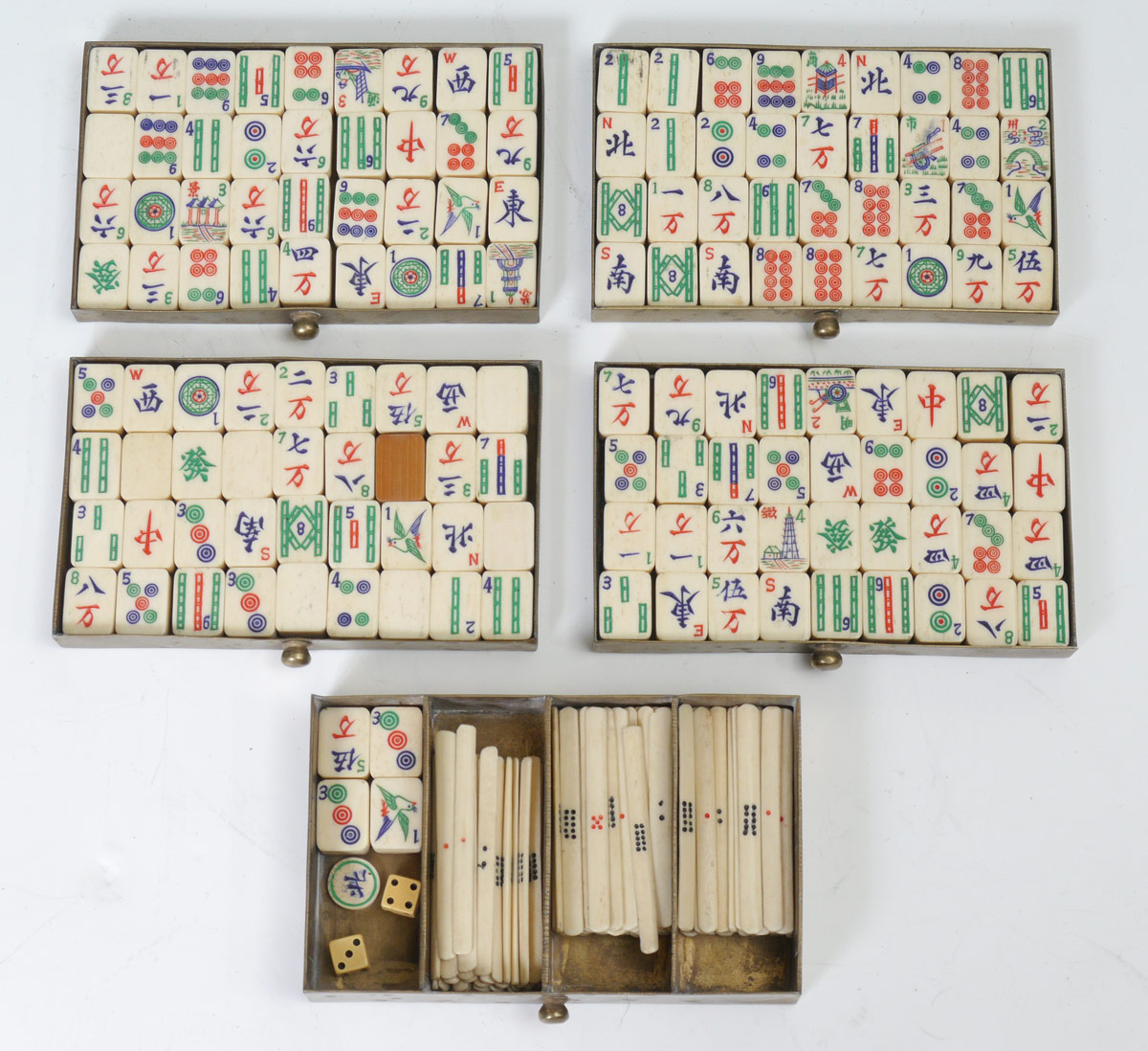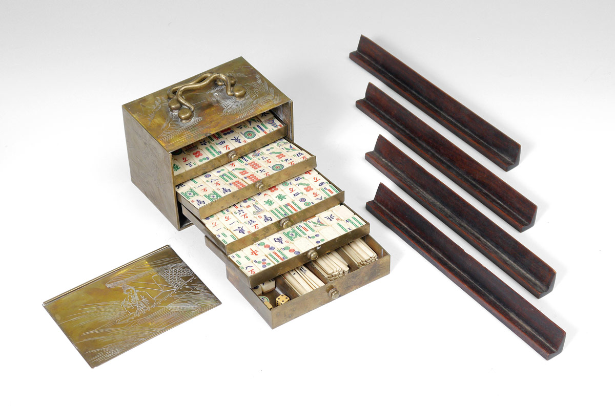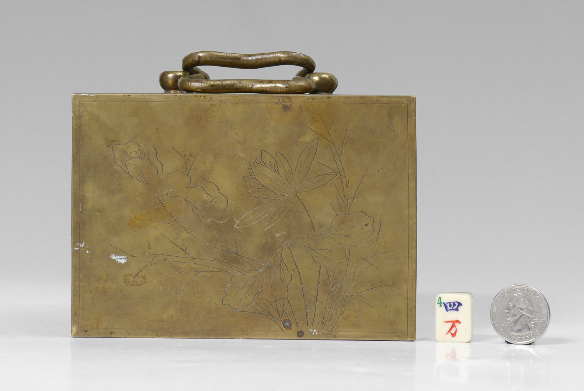 ENGRAVED BRASS CASE MAHJONG SET: 148 bone and bamboo mahjong pieces with dice and betting sticks. Comes in brass case with engraved oriental motifs and 5 trays. Overall case measures 4'' x 5 1/2'' x 3 1/2''. Sold with 4 tile holders, 10'' long.