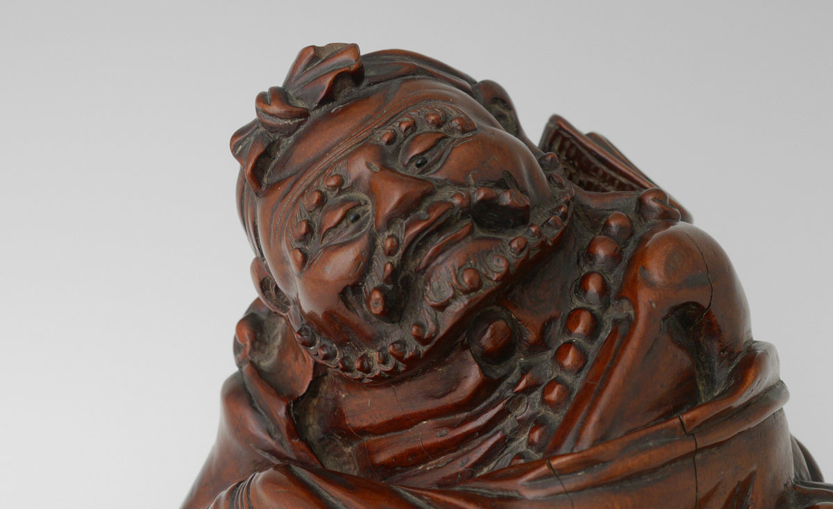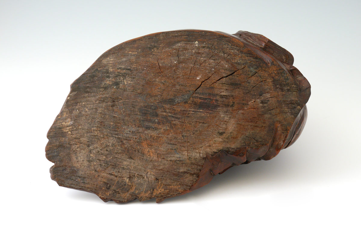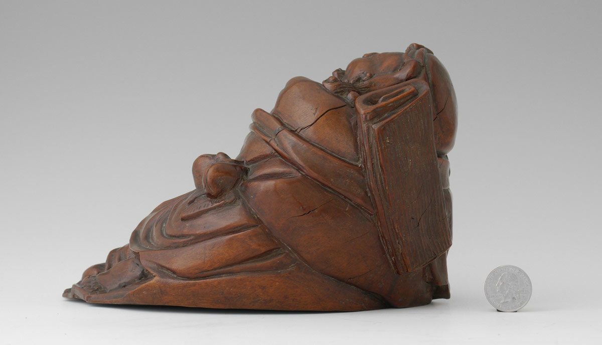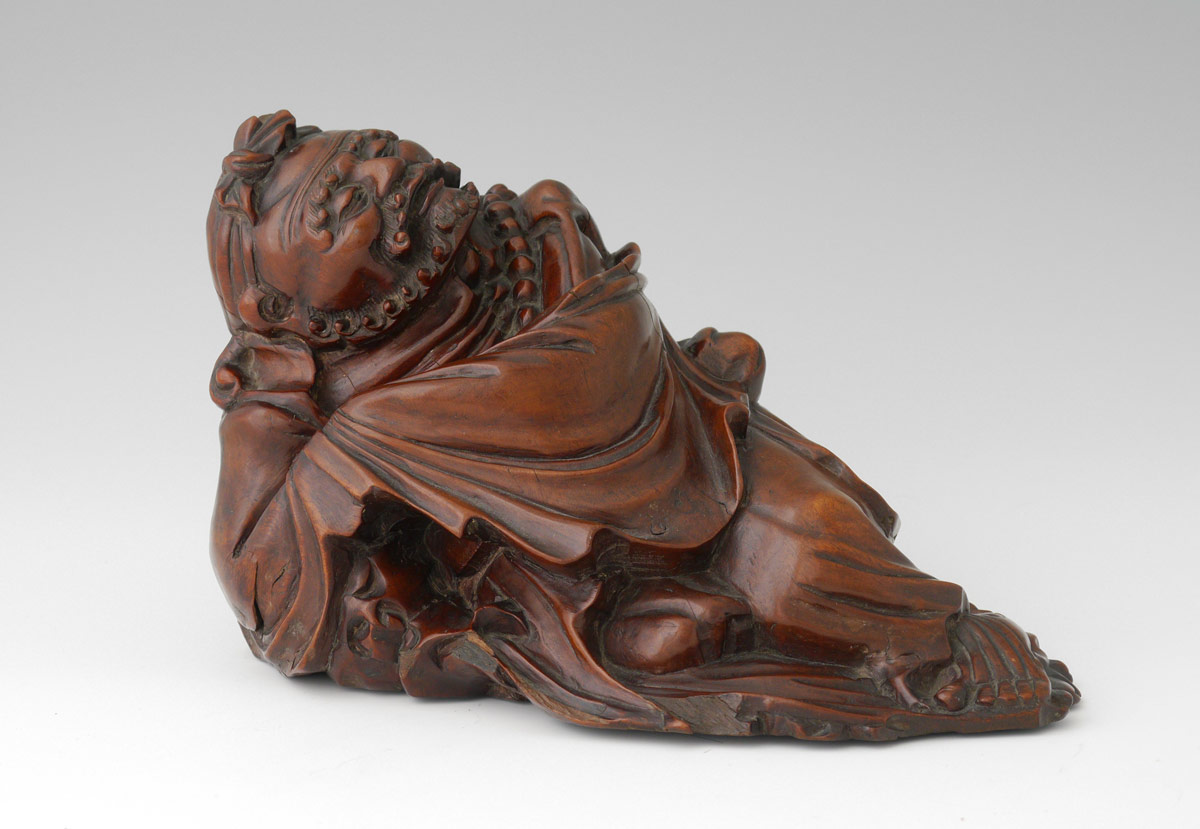 MEIJI PERIOD CARVED ROSEWOOD FIGURE: Figure of a reclining man with bed roll and robes. 5 3/4'' h. x 9'' x 5 1/2''.