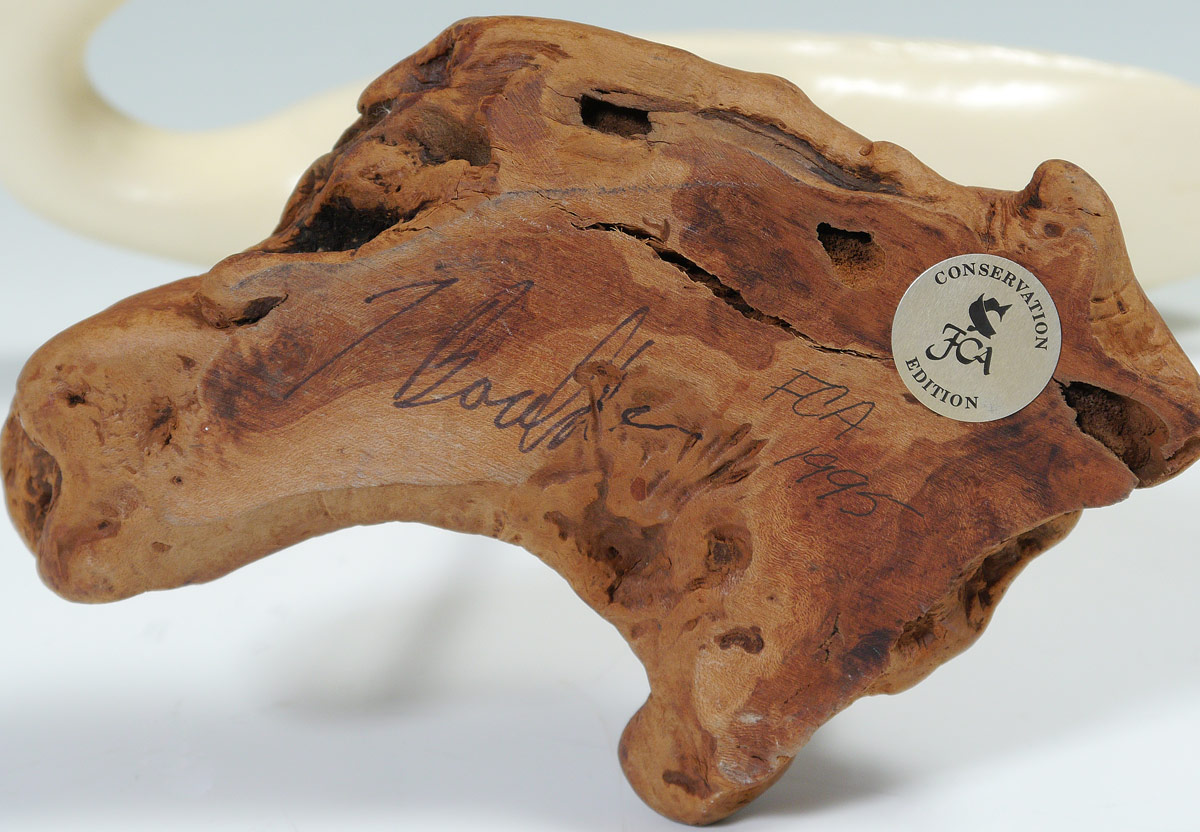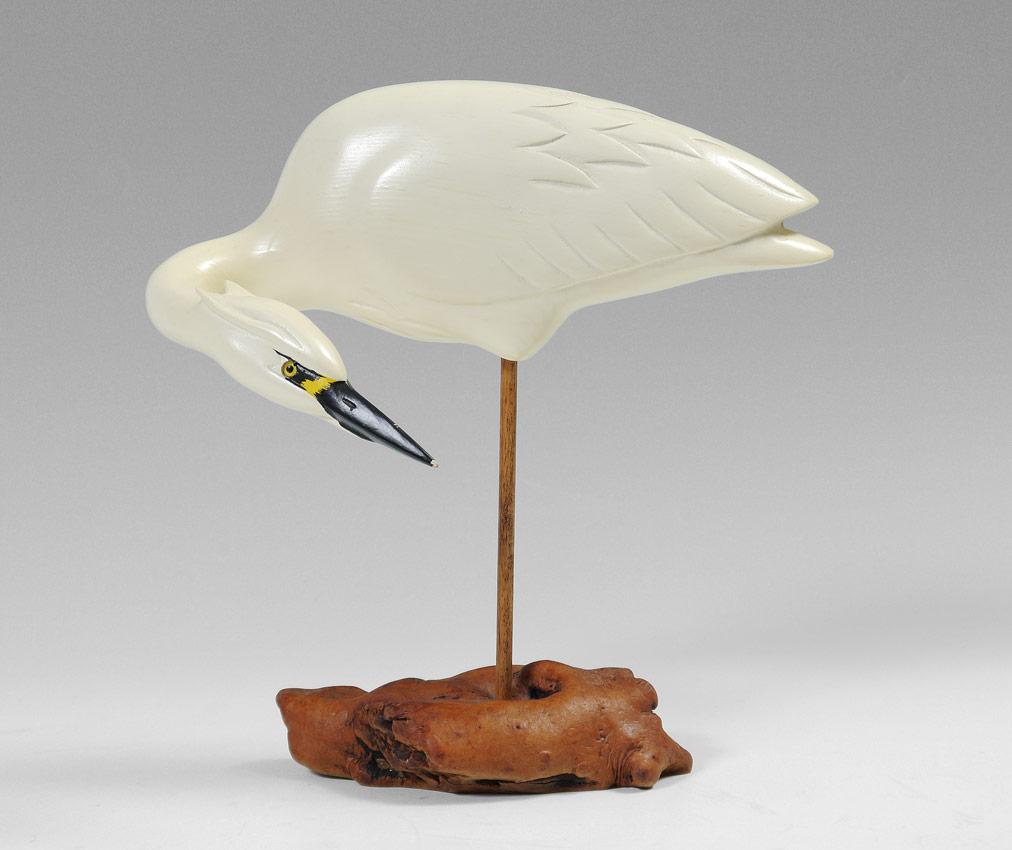 CARVED WOOD FIGURE OF A EGRET: Carved and painted, driftwood base. Illegibly signed T. Boulder and dated 1995 under base. Measures 11'' h. x 10 1/4'' x 4''.