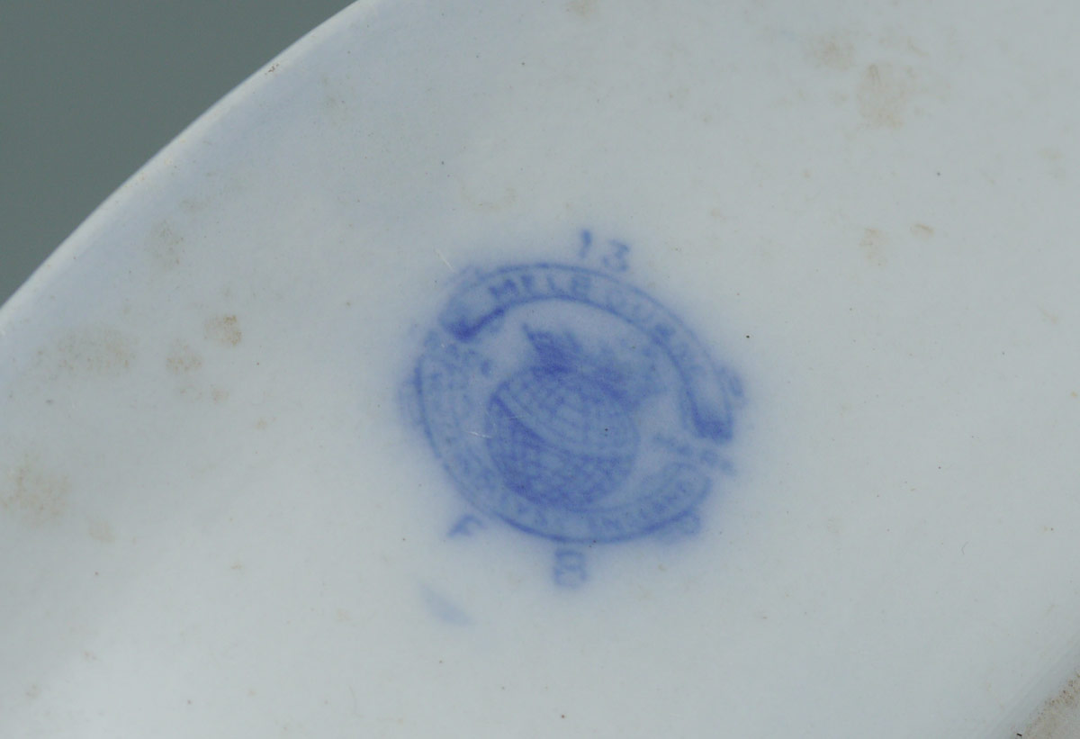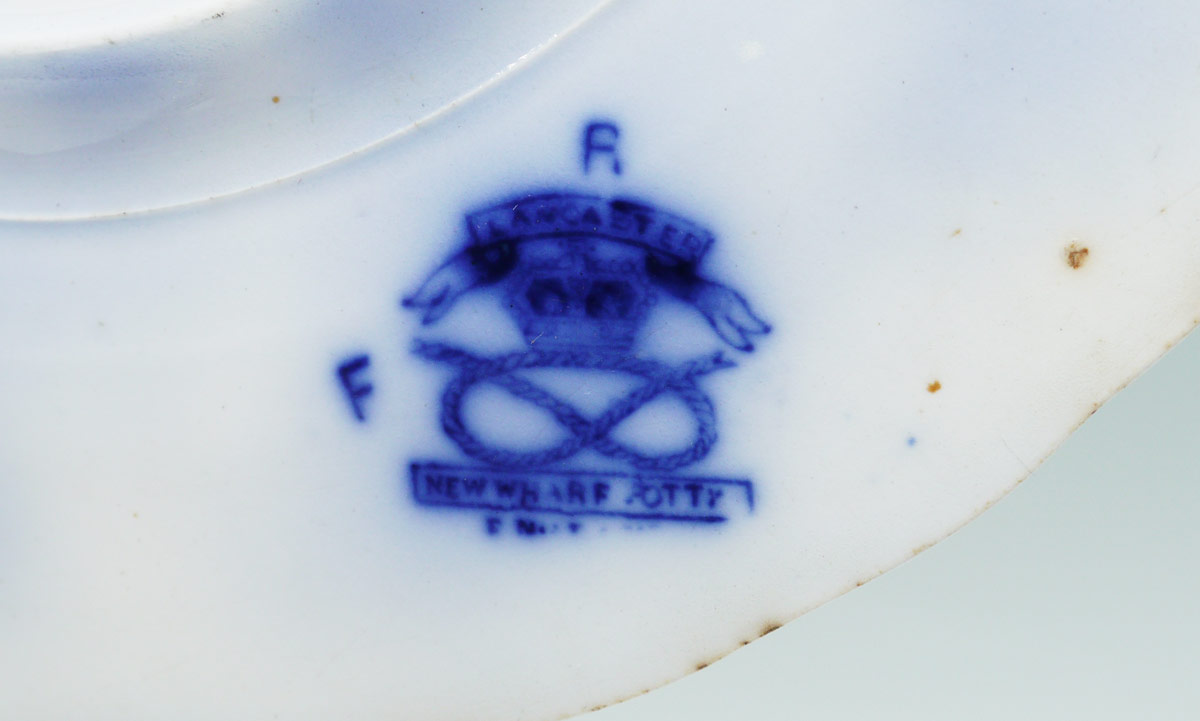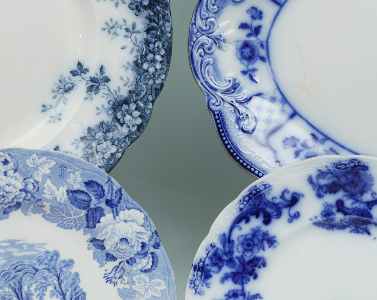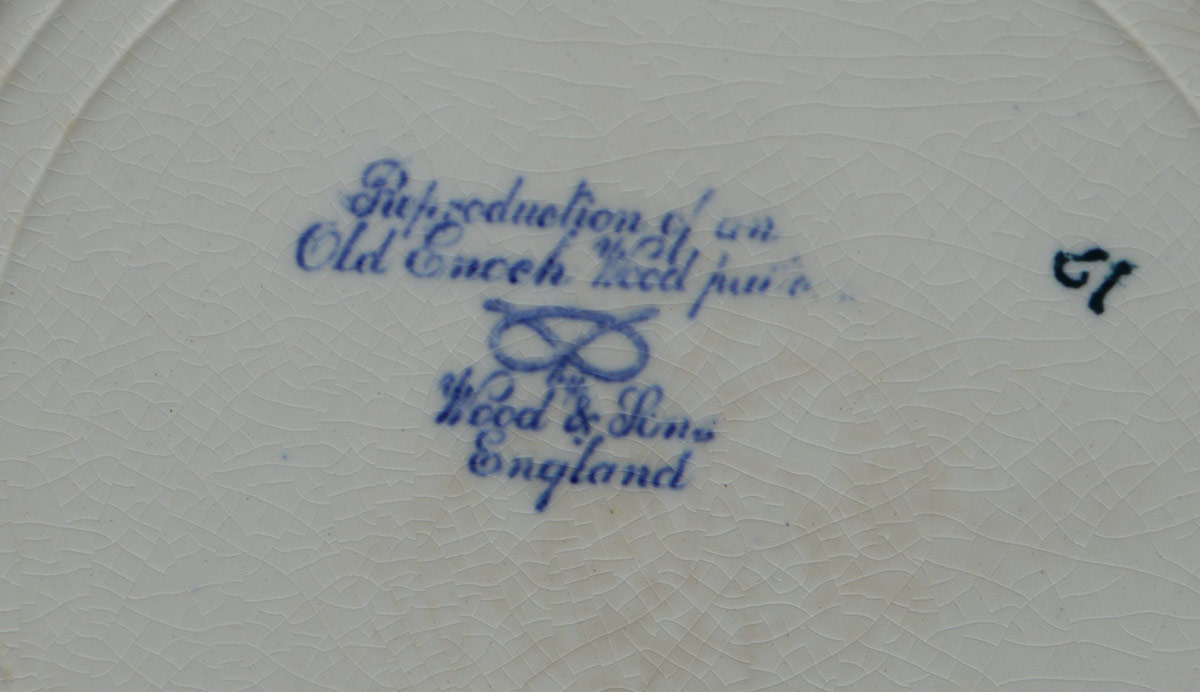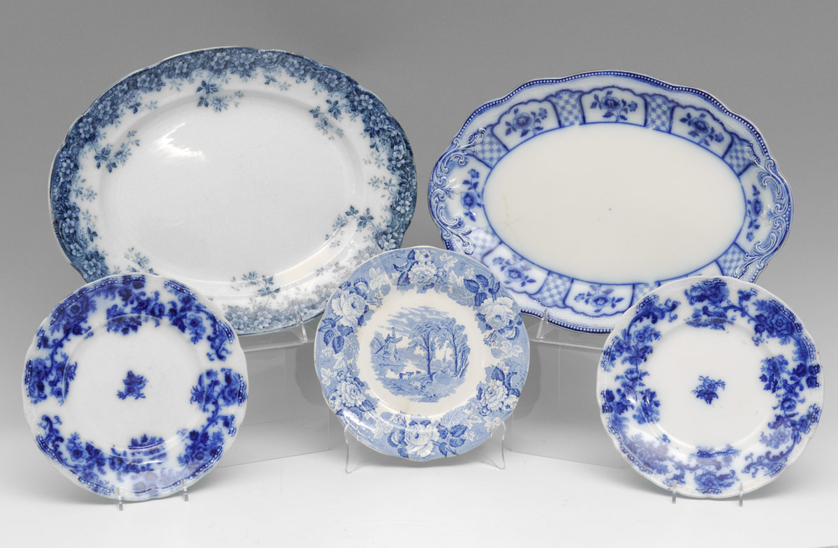 5 PIECE ENGLISH FLOW BLUE PLATTERS AND PLATES: 1-2) Pair of New Wharf Lancaster plates (9''). 3) Melbourne platter (16''), 4) Booths Canterbury platter (16''), and 5) Wood & Sons copy of an Enoch Woods pattern plate (9'').