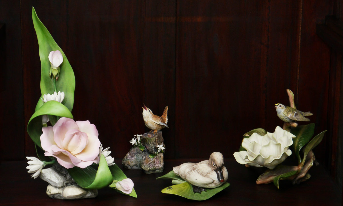 BOEHM PORCELAIN GROUP: 1) PEACH ROSE WITH DAISIES #300-38, Limited Edition #16, 1980. 15'' h. x 8 1/2'' x 6''. 2) DUCKLING ON LILY PAD #400-13, 10 3/4'' x 8'' x 5 3/4''. 3) WREN on rock with flowers, 5 3/4'' h. x 4 1/4'' x 3''. Sold with BURGUES KINGLET FIGURE on flowering magnolia branch. Limited Edition #369 of 450, 6 3/4'' x 10'' x 7''.