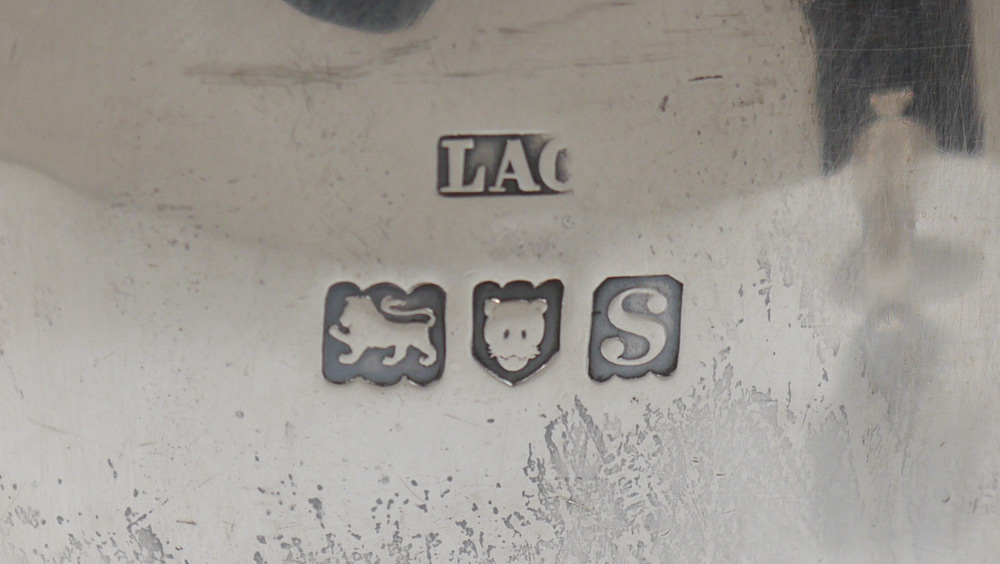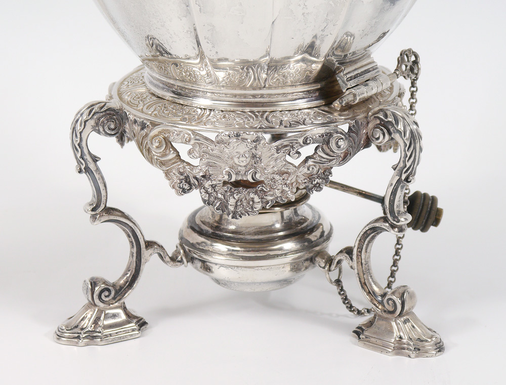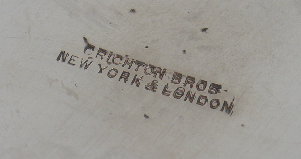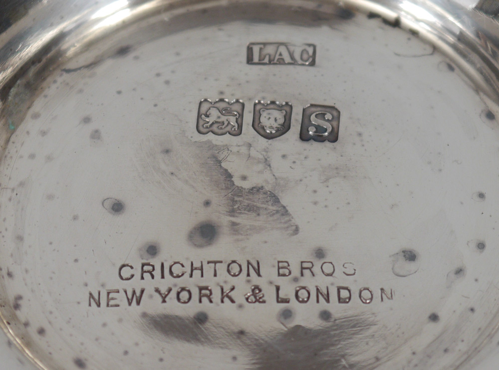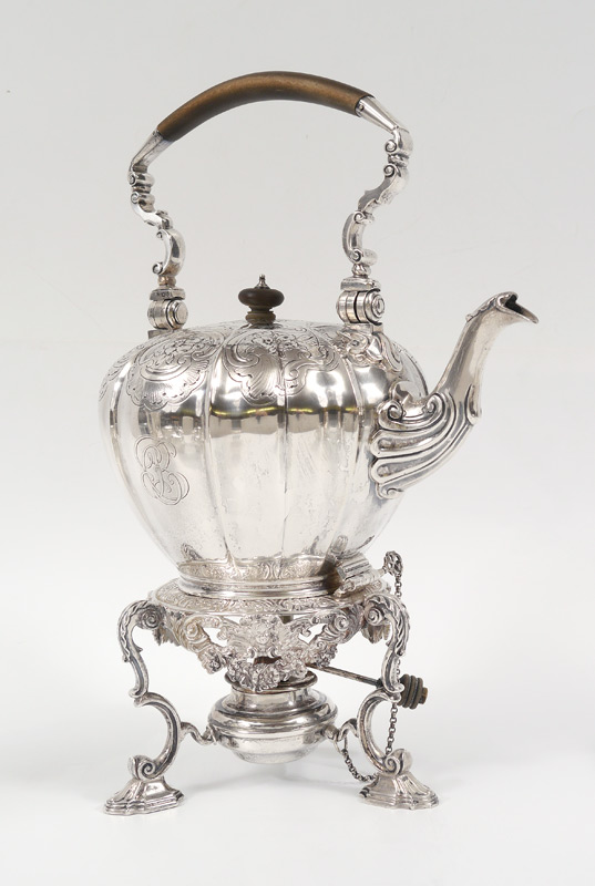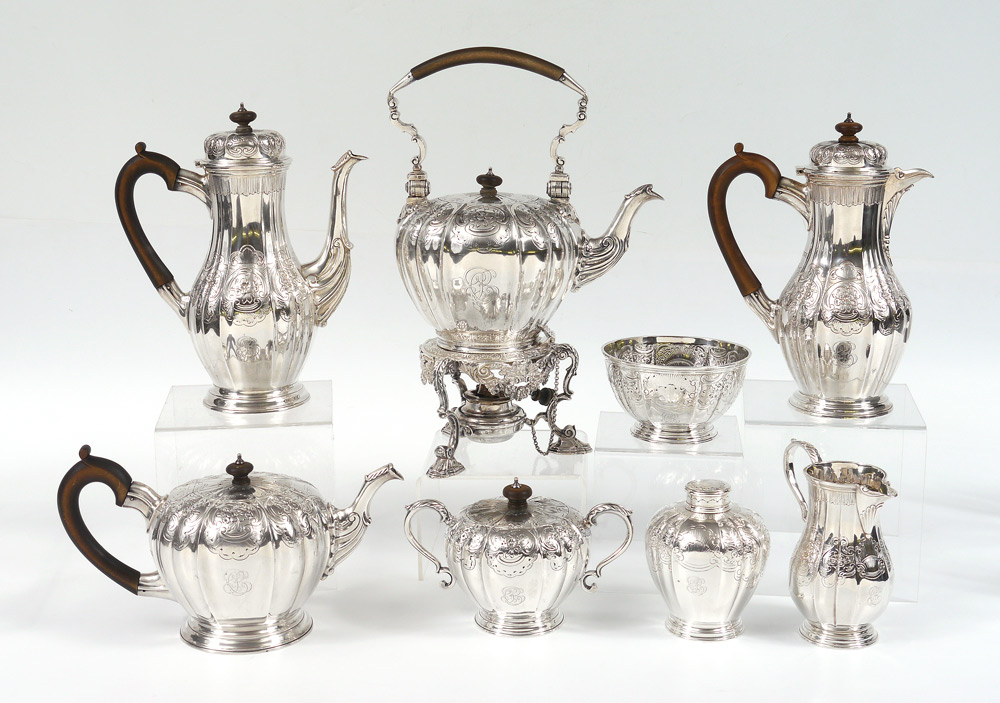 CRICHTON BROTHERS 8 PIECE ENGLISH SILVER TEA SERVICE: Circa 1912-13, embossed and engraved foliate motifs on each piece by Crichton Brothers, New York and London to include 1) Hot water kettle on stand with burner, hinged lid, articulated handle with wood. 10 1/2'' h. x 10''. 2) Coffee pot, hinged lid, wood handle, 10 3/4'' h. x 9''. 3) Chocolate pot, hinged lid, wood handle, 10 1/4'' x 8''. 4) Tea pot with hinged lid, wood handle, 6'' h. x 11 1/4''. 5) Open creamer, 6'' h. 6) Covered sugar, 5'' h. x 7 1/2''. 7) Covered tea caddy, 5'' h. x 4''. 8) Open waste bowl, 3'' h. x 5 1/4''. Each piece monogrammed. Approx. 207.4 troy oz inclusive of wood handles and finials. Estate of Elton Hoyt II