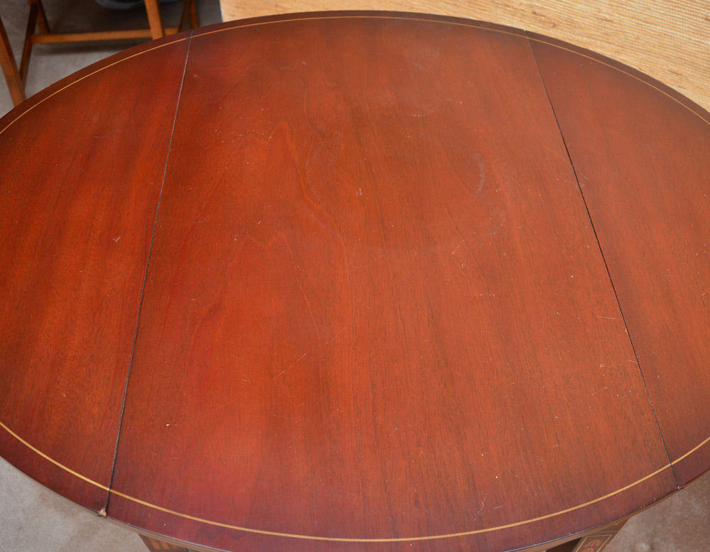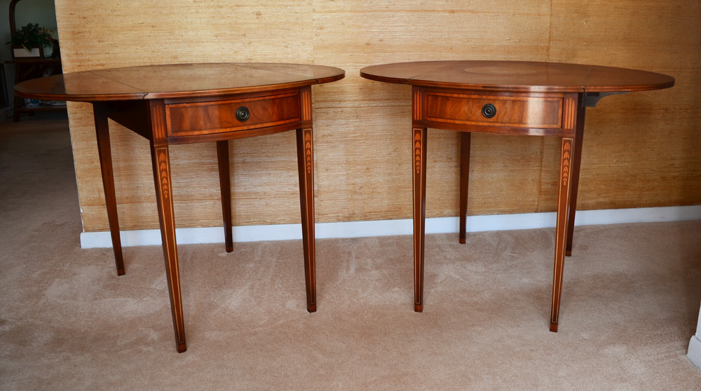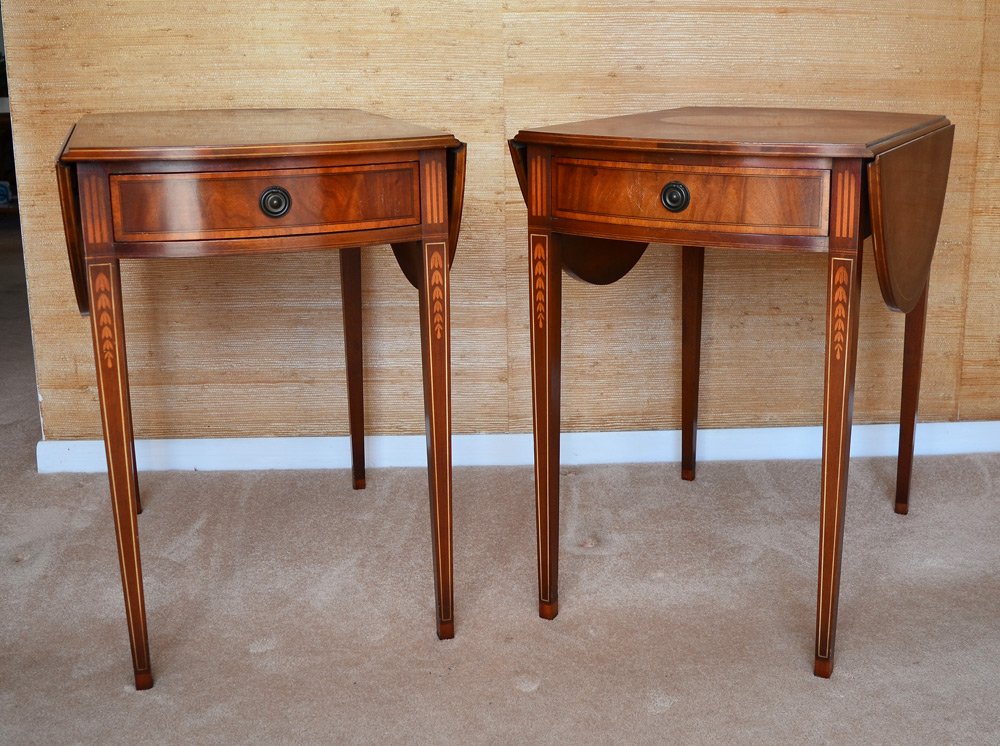 PAIR PEMBROKE SIDE TABLES: Banded mahogany with bell flower and string inlay. Single drawer, 28'' h. x 30'' x 19 1/2''.