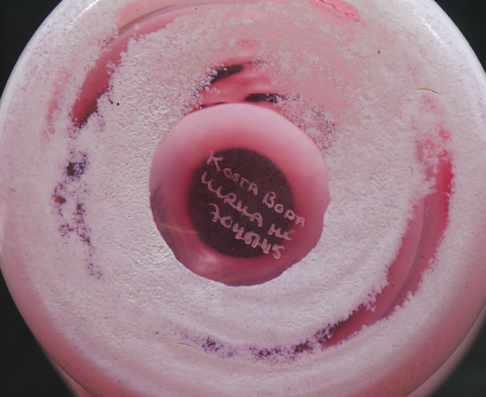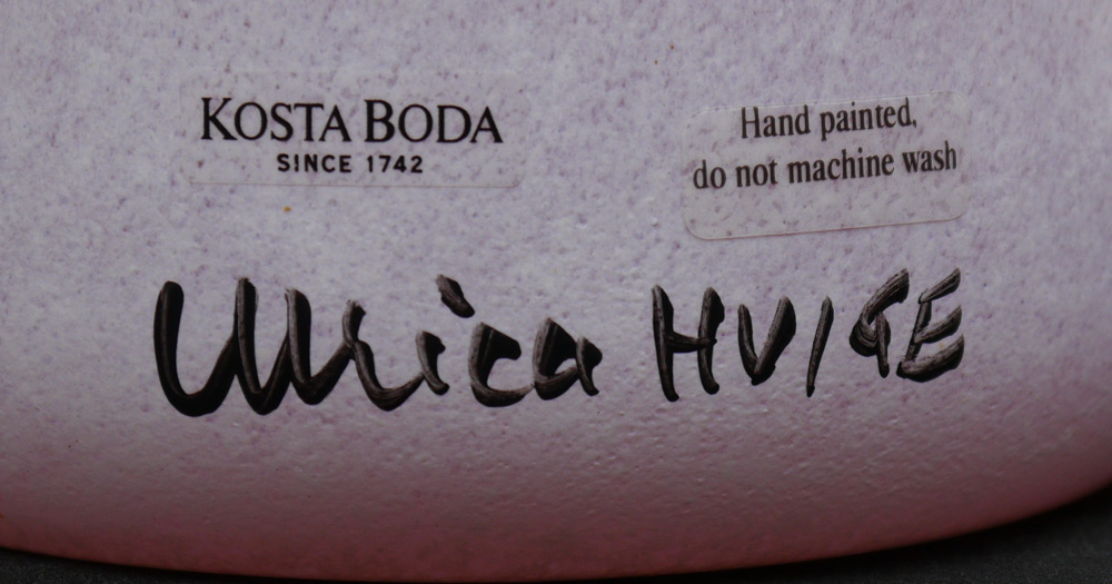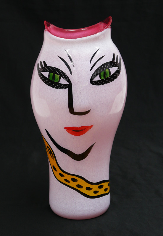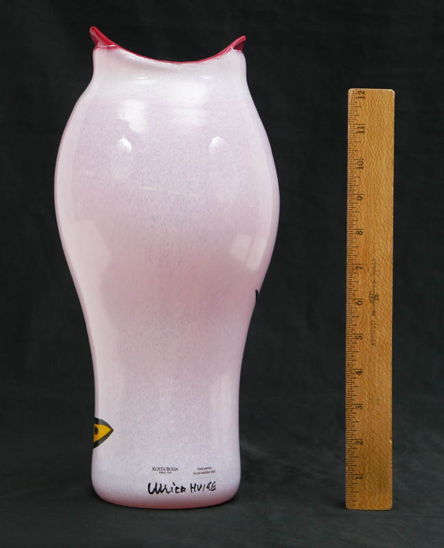 ULRICA HYDMAN-VALLIEN FOR KOSTA BODA VASE: From her sucessful ''Open Minds'' collection, pink glass hand decorated with cat like face and snake. Original clear labels on back, signed. Overall measures 13 3/4'' h. x 6 1/4''.
