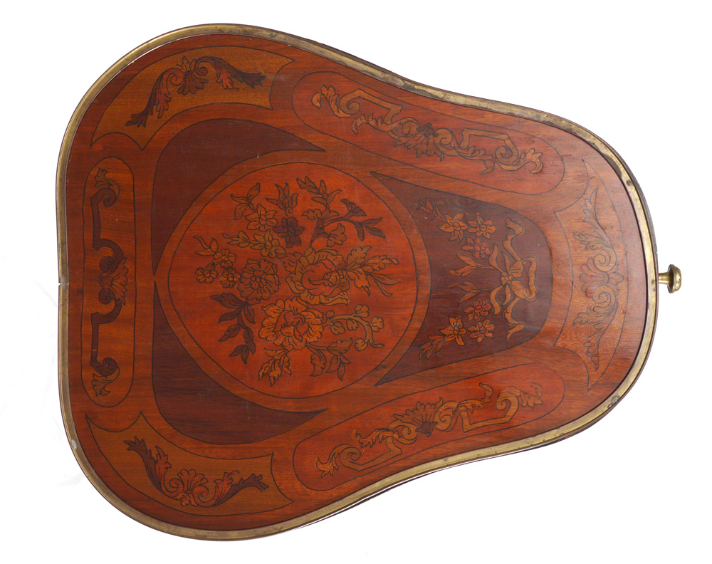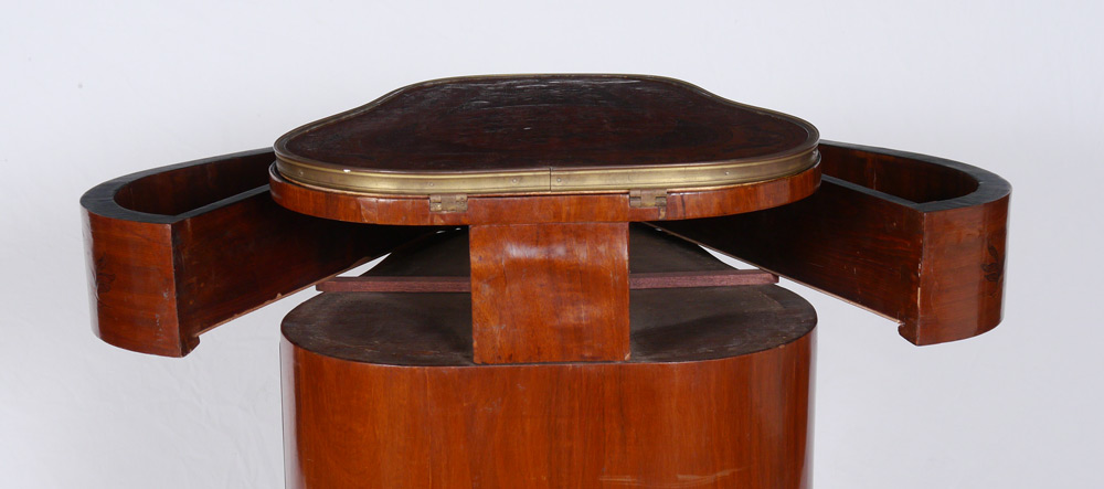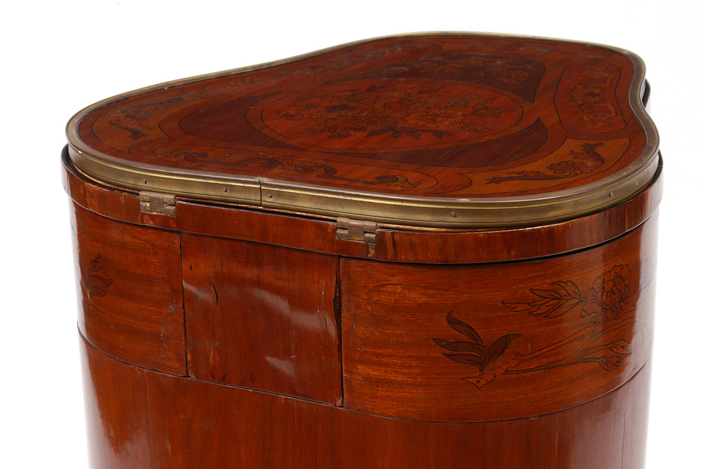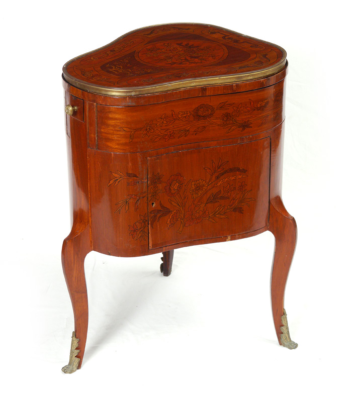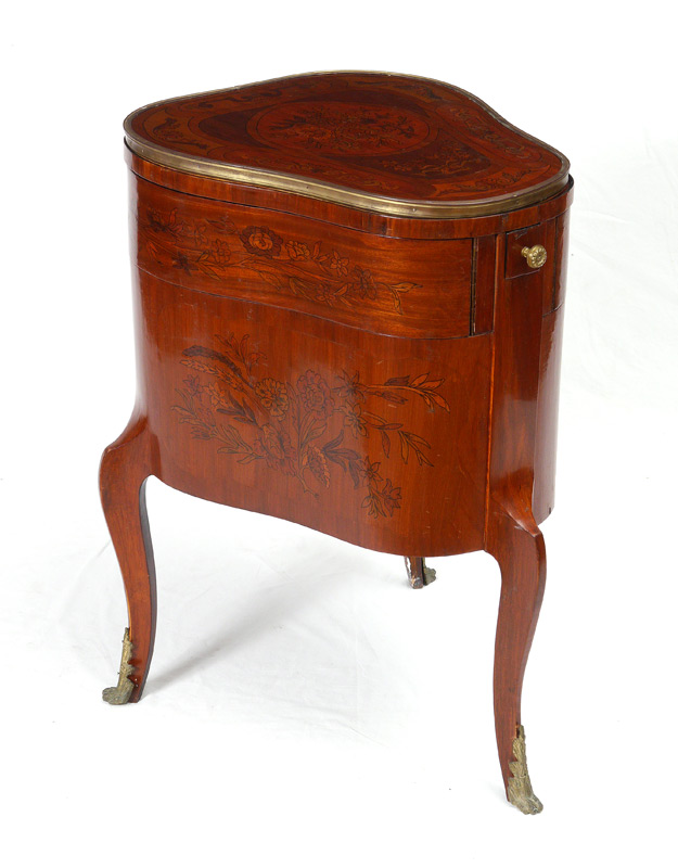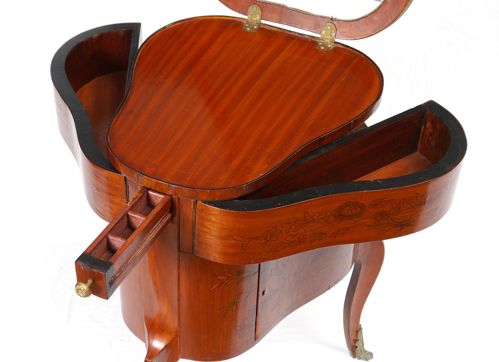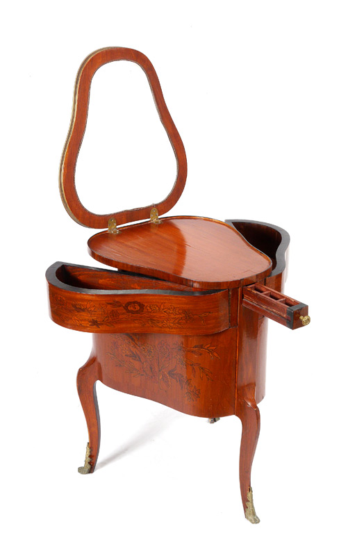 FRENCH TREFOIL MECHANICAL DRESSING TABLE: Floral marquetry inlay to top and sides, trefoil shaped body. Top lifts for mirror, small front drawer pulls open to also open the side drawers, single door on one side. 32 1/2'' h. x 22 3/4'' x 25''.