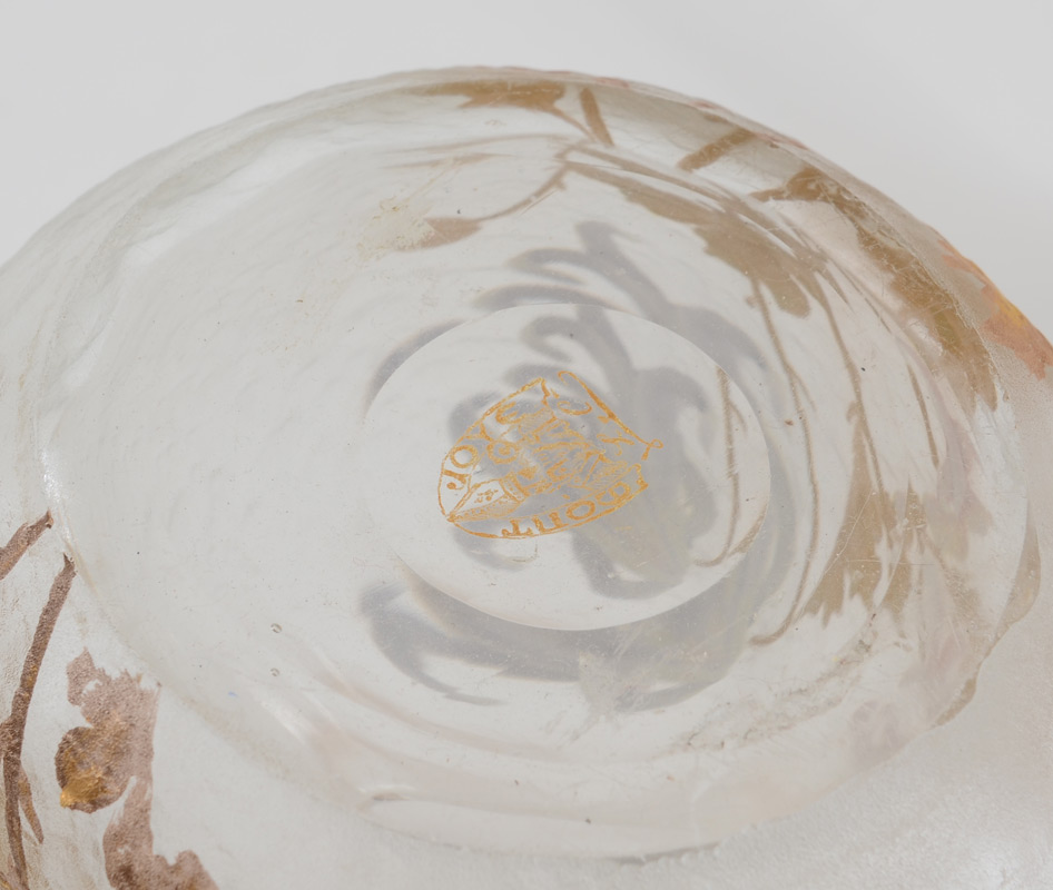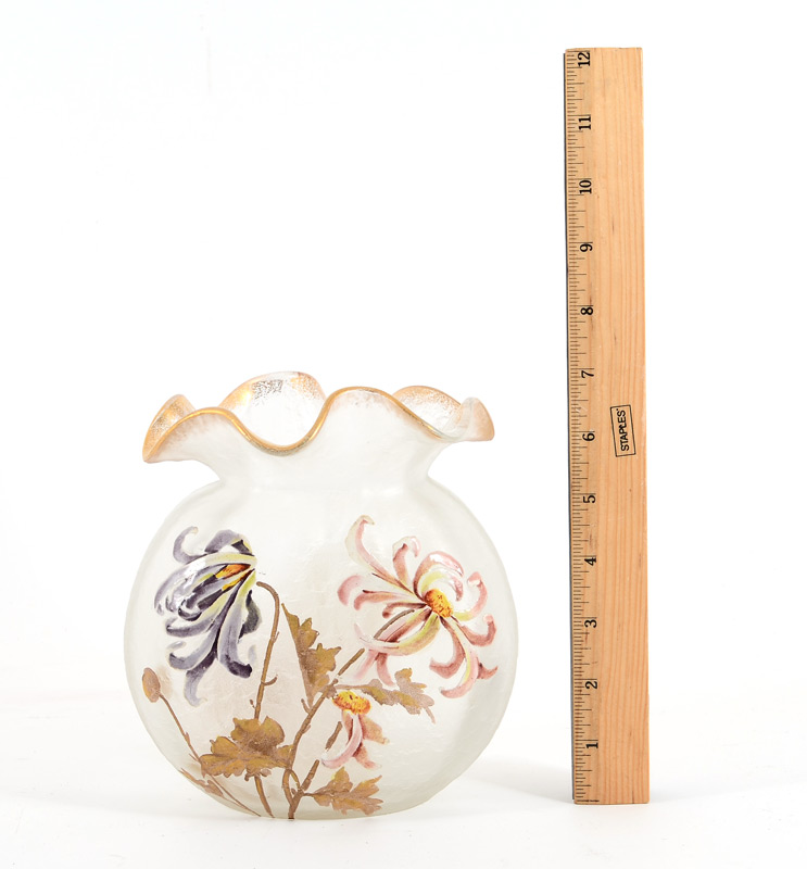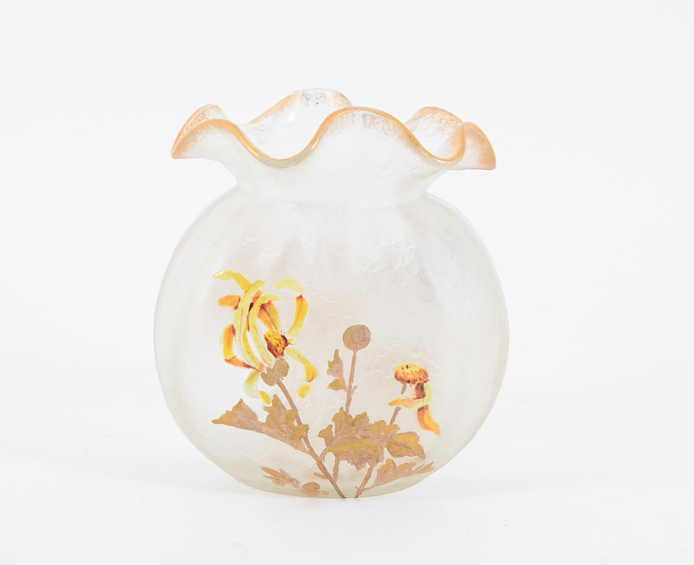 MONT JOYE SIGNED ART GLASS VASE: Textured clear glass with enameled floral chrysanthemum design, scalloped rim with gilt decoration, marked on base with Mont Joye LC shield. Overall 6 3/4'' h. x 6 1/4'' x 5 1/4''.