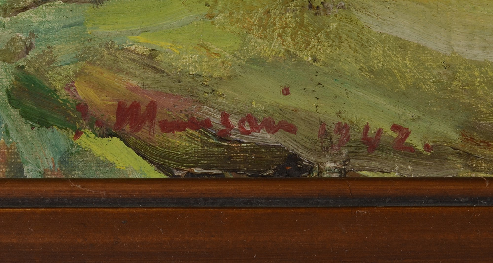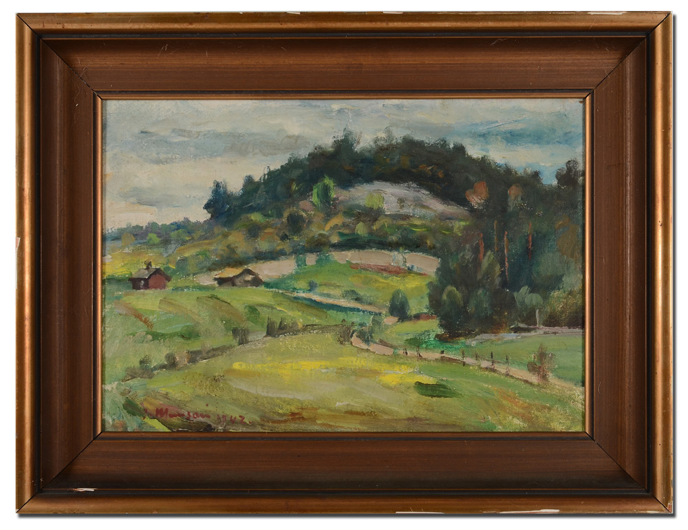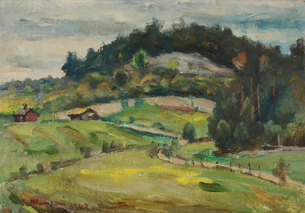 MUUSARI, Janne, (Finnish, 1886-1966): Country Landscape, Oil/Canvas, stretched over board, 10 1/2'' x 15'', signed lower left, dated 1942, gilded frame with wear 14'' x 18 3/4'', signed verso, illegibly titled.
