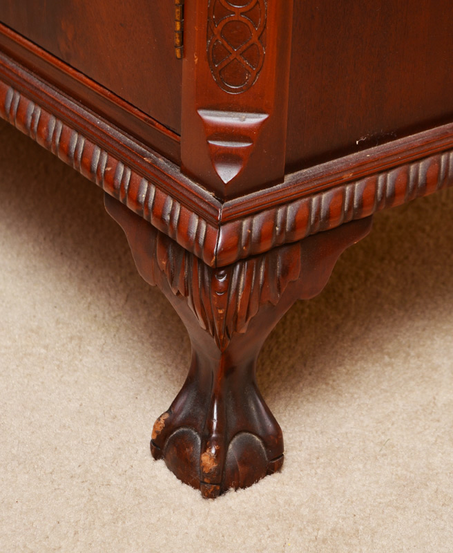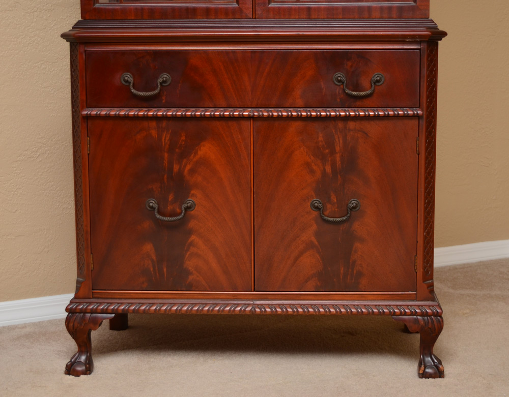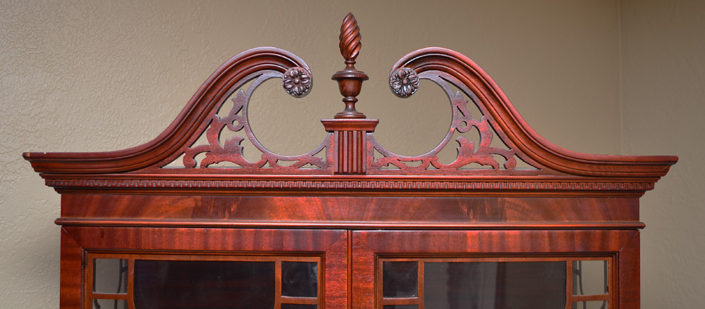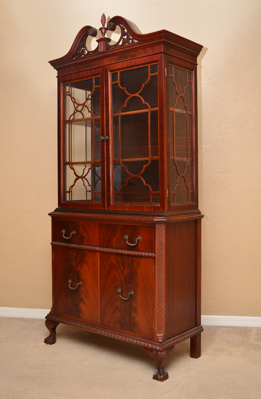FINCH FINE FURNITURE MAHOGANY CHINA CABINET: Broken arch pediment with carved decoration and spire finial. Glass doors and sides with fretwork, 2 wood shelves. Base with single drawer with metal tag over 2 doors, claw and ball front feet. 78'' h. x 35 1/2'' x 16 3/4''.