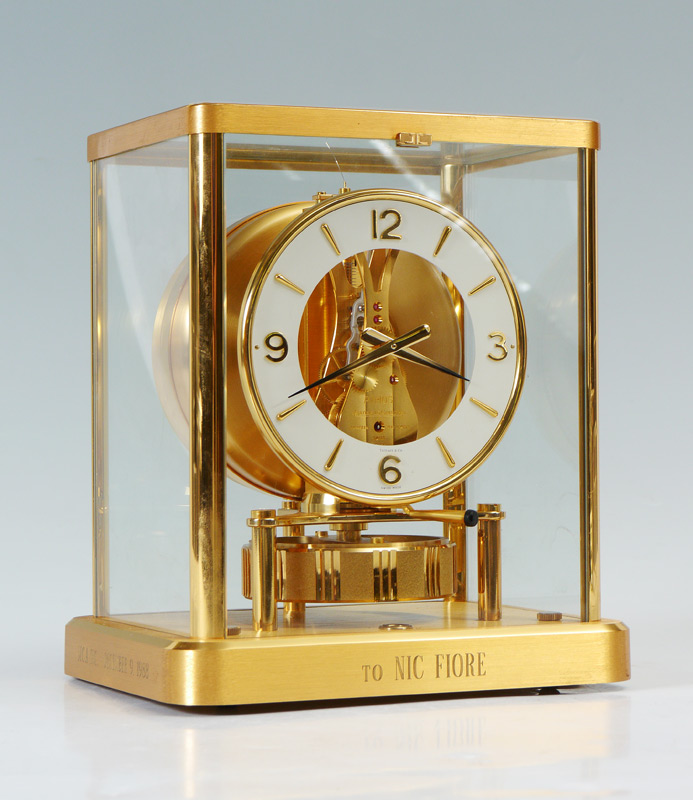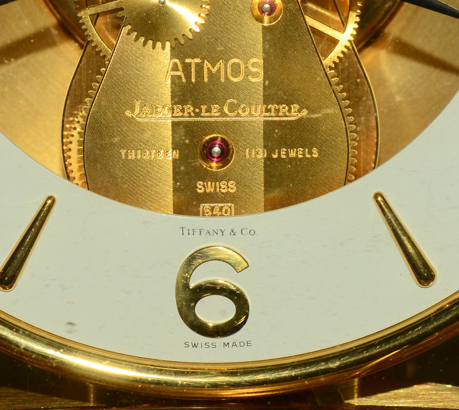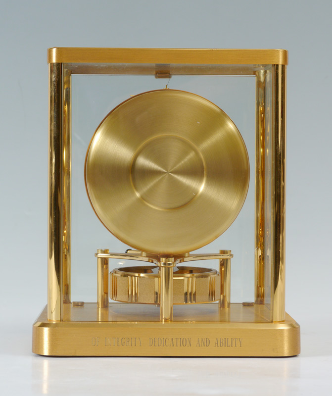 JAEGER LE COULTRE ATMOS CLOCK FOR TIFFANY & CO.: Model 540 with brass frame, glass sides and top, 13 jewel movement marked with typical Atmos markings. Dial Marked Tiffany & Co., Swiss Made, base of case with dedication on all 4 sides, dated 1988. Overall measures 9'' h. x 7 3/4'' x 6''. Sold with Tiffany & Company Bag.