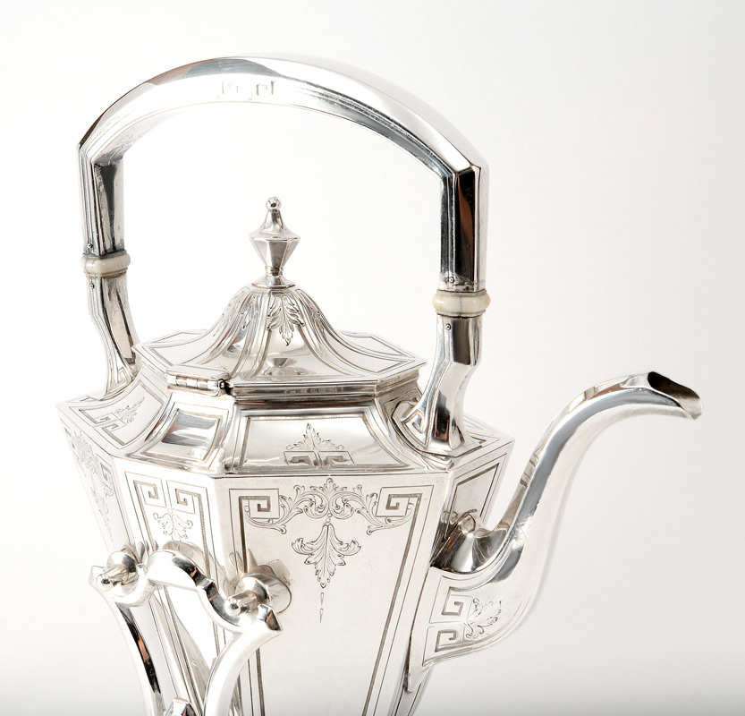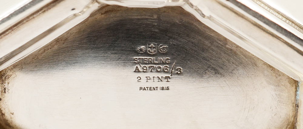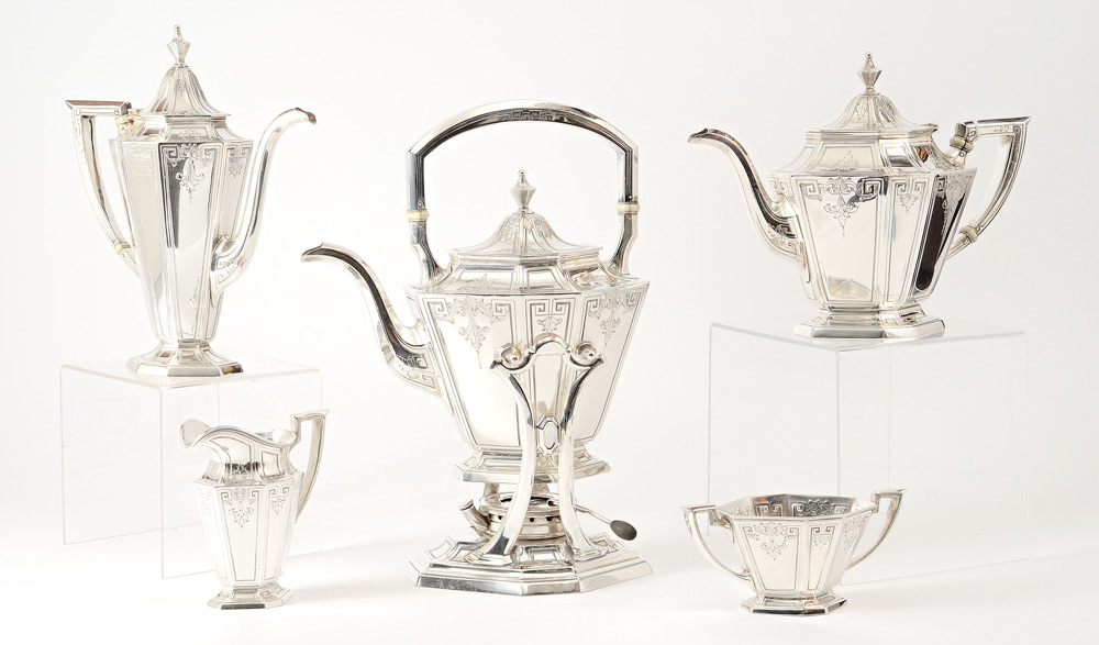 5 PIECE 1915 GORHAM STERLING TEA SERVICE: 5 pieces with engraved paneled sides to include 1) Hot water kettle with hinged lid, removable from stand with articulated burner opening, #A9706. Overall 12 1/4'' h. x 10'' x 5''. 2) Coffee pot with hinged lid, #A9711, 9'' h. 3) Tea pot with hinged lid, #A9702, 7 1/4'' h. 4) Open creamer, #A9713, 4 5/8'' h. 5) Open sugar, #A9712, 6 1/8'' wide. Majority of pieces marked with Gorham 1915 date code as well. Approx. 81.3 troy oz.