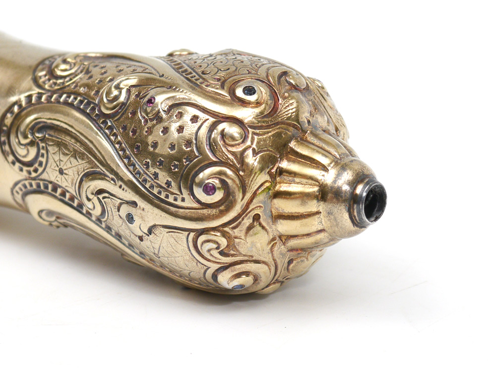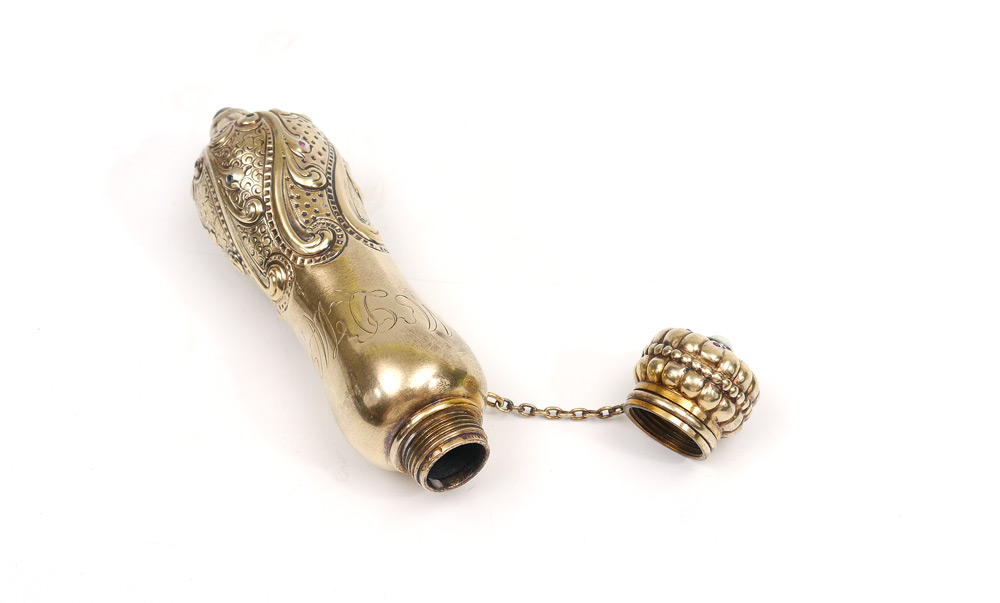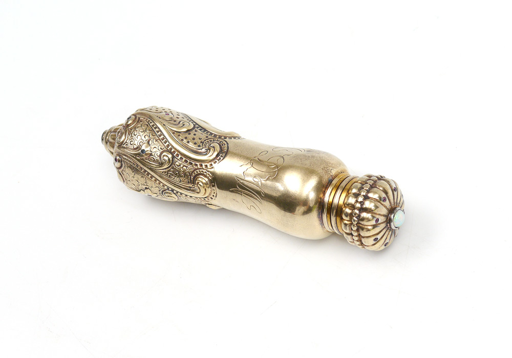 TIFFANY STERLING 1900'S VINAIGRETTE: Inset opal at top, heavily chased scroll, vermeil wash all over, and accented with tiny gem chips of rubies and sapphires. Marked with Dominick & Haff makers mark, Tiffany & Co., 62, Sterling. Monogrammed, 5'' long, overall 2.2 troy oz.