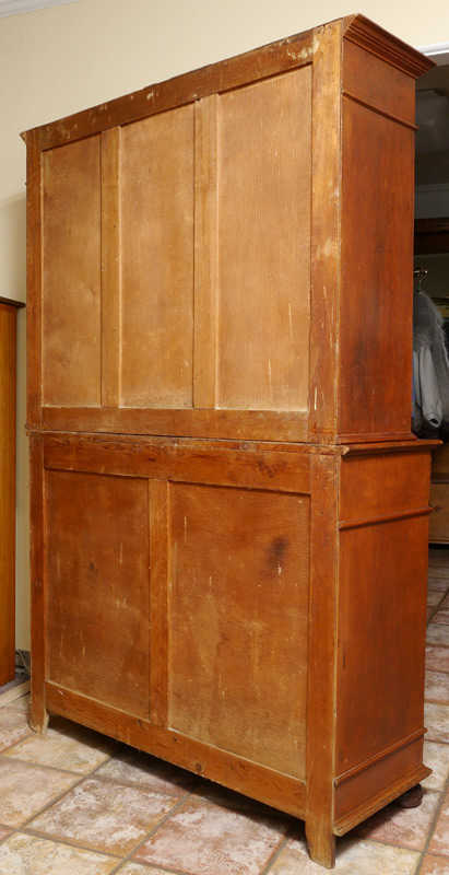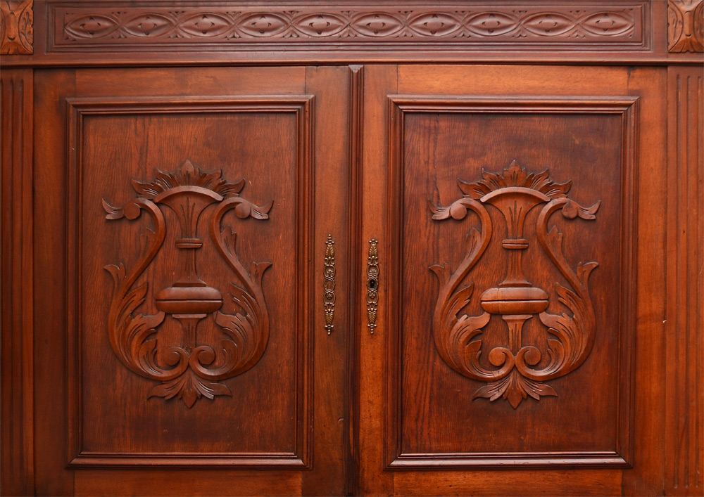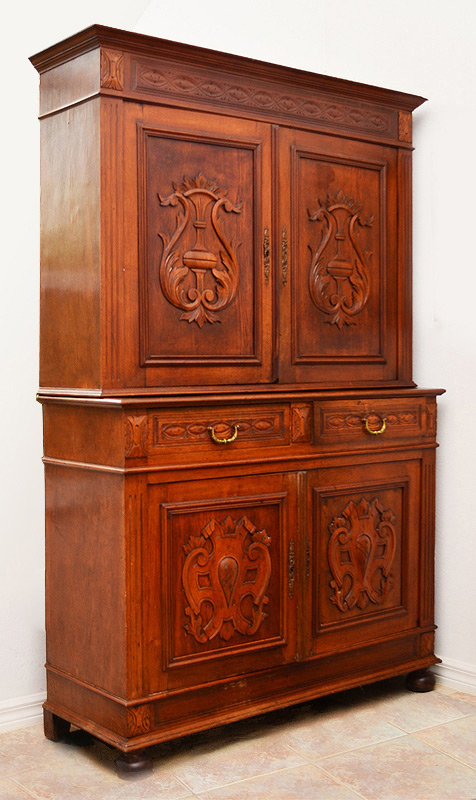 CARVED WALNUT CUPBOARD: Upper section with carved decoration at top, 2 doors with applied foliate scroll and urn motif open to shelved interior. Base with 2 carved drawers over 2 doors with applied shield motif. Overall 73 1/4'' h. x 46 1/4'' x 16 3/4''.