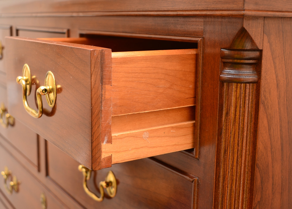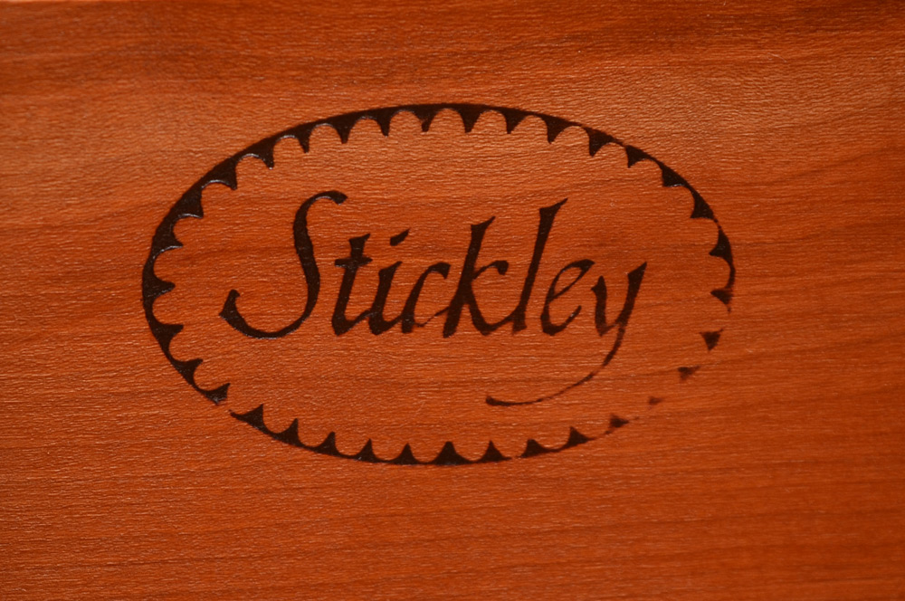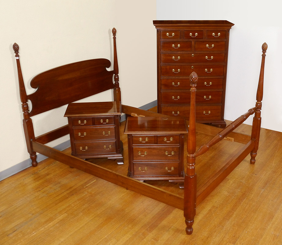 L & JG STICKLEY CHERRY BEDROOM SUITE: Contemporary set to include bed with removable carved finials, head and foot boards measure 58'' h. x 63 1/4'' x 3 1/4'', rails 81'' long. Tall chest of drawers, 3 drawers over 2 drawers over 5 graduating full length drawers, 60 1/2'' h. x 42 1/2'' x 21''. Pair of 3 drawer nightstands, 26 3/4'' h. x 25 1/4'' x 16 1/4''.