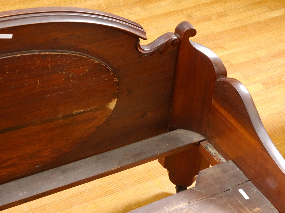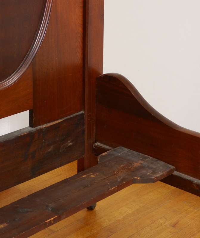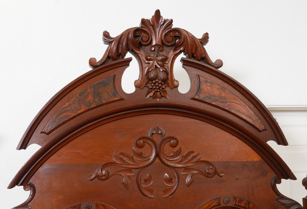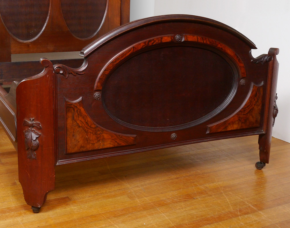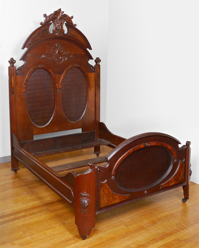 CARVED HIGH VICTORIAN BED: Headboard with foliate scroll and fruit motif carved crest, applied decoration, burl veneer accents, 2 recessed medallions. Foot board with matching decoration, single medallion, applied decoration at corners. Headboard 91 3/4'' h. x 61 1/2'' x 3 1/4'', foot board 35 1/4'' h., rails 72''. Sold with 4 removable castors (not included in height).