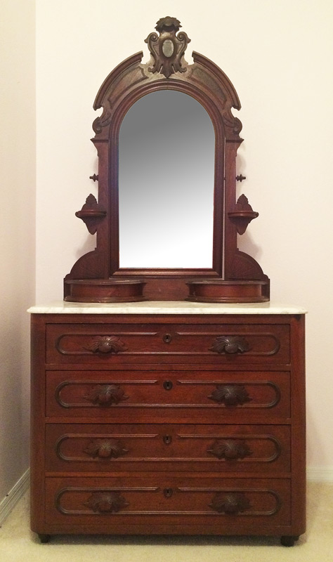 VICTORIAN MARBLE TOP DRESSER WITH MIRROR: Carved mirror with candle stands and glove boxes. 4 drawer marble top base with carved wood pulls, top drawer compartmentalized. Overall measures 85'' h. x 41 1/2'' x 20 1/4''.